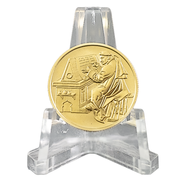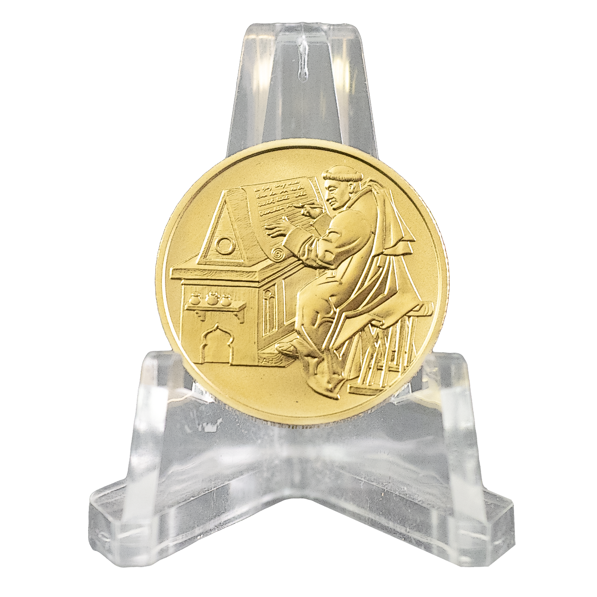 On the obverse, the twin figures of Saint Benedict and Saint Scholastica symbolize the enduring legacy of monastic life, while the reverse depicts a monk carefully copying manuscripts — a stirring homage to the light of knowledge preserved through history.