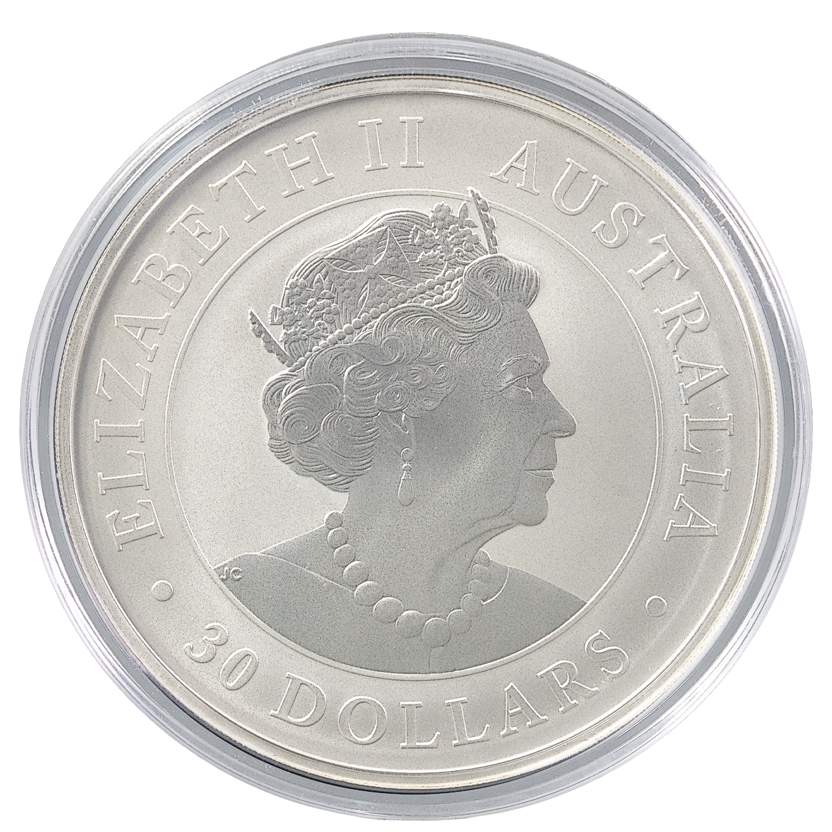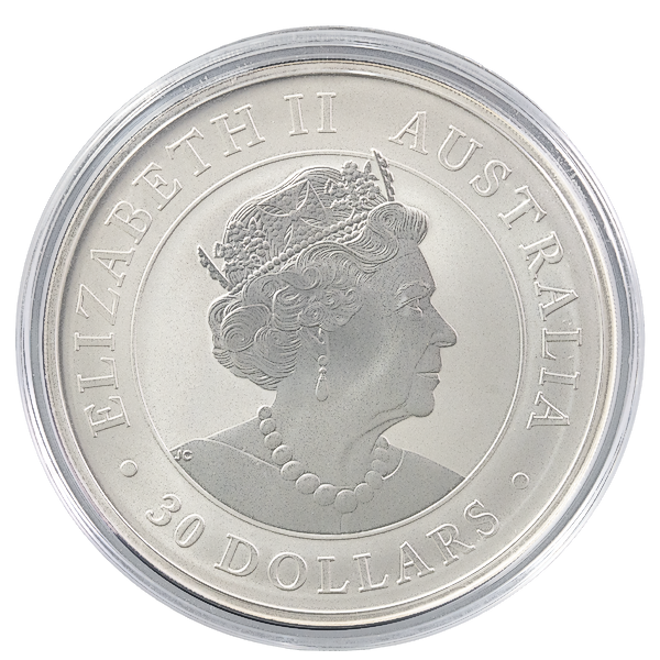 The obverse of the 1 kg coin displays a head portrait of Queen Elizabeth II, Australia’s monarch.