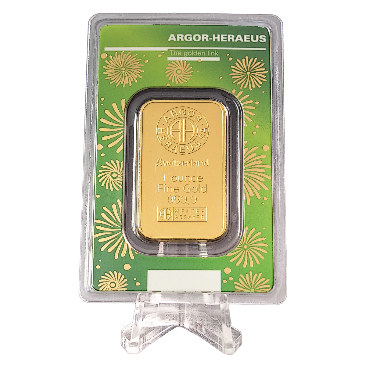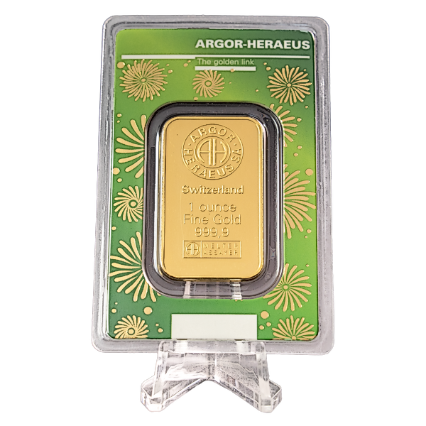 The front of the 1 oz gold bar is embossed with the famous Argor-Heraeus refinery stamp which consists of an 'AH' motif encircled by the words 'ARGOR HERAEUS SA', The front surface also contains the refinery location 'Switzerland', the bar's weight and fine gold content, '1 ounce Fine Gold 999.9', and the bar's unique serial number and Assay stamp.