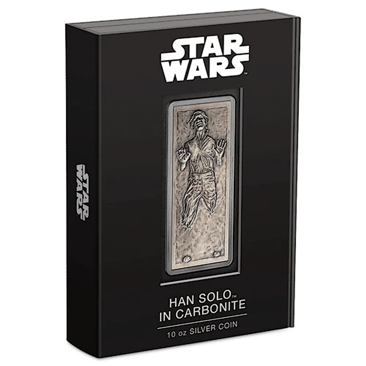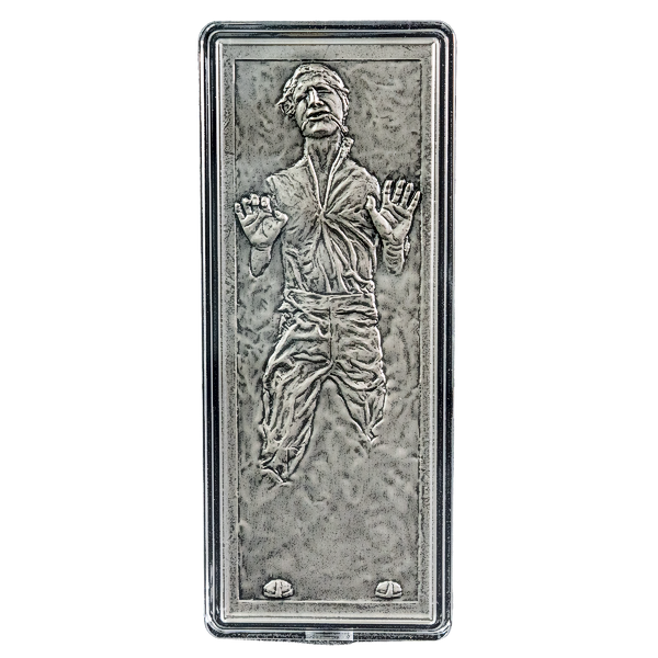Travel to Bespin™ and save Han Solo™ trapped in carbonite! As seen in the 1980 film, Star Wars: The Empire Strikes Back™, this hefty 10 oz pure silver bar has been shaped like a bar and engraved to showcase the frozen intergalactic smuggler. An antique finish has also been applied to further highlight the detail.