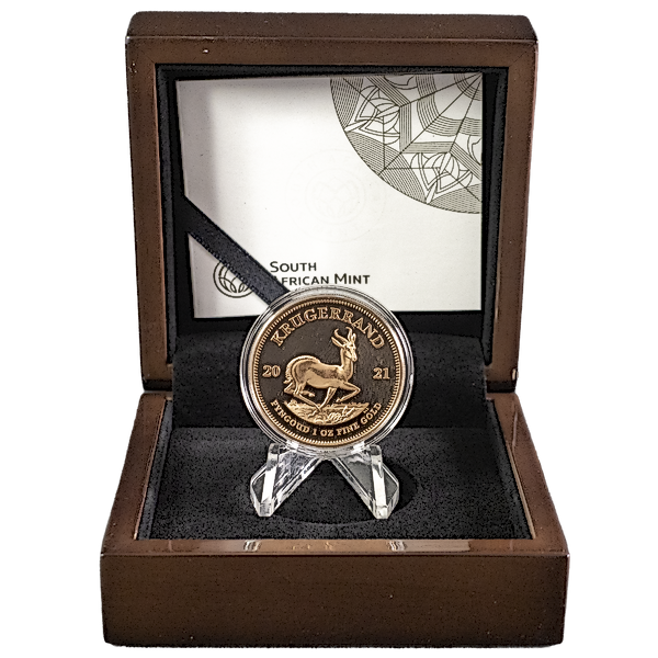 Up for bidding is 2021 1 oz South African Gold Krugerrand Proof Coin. The 1 oz Proof Gold Krugerrand Coin is minted by Rand Refinery.