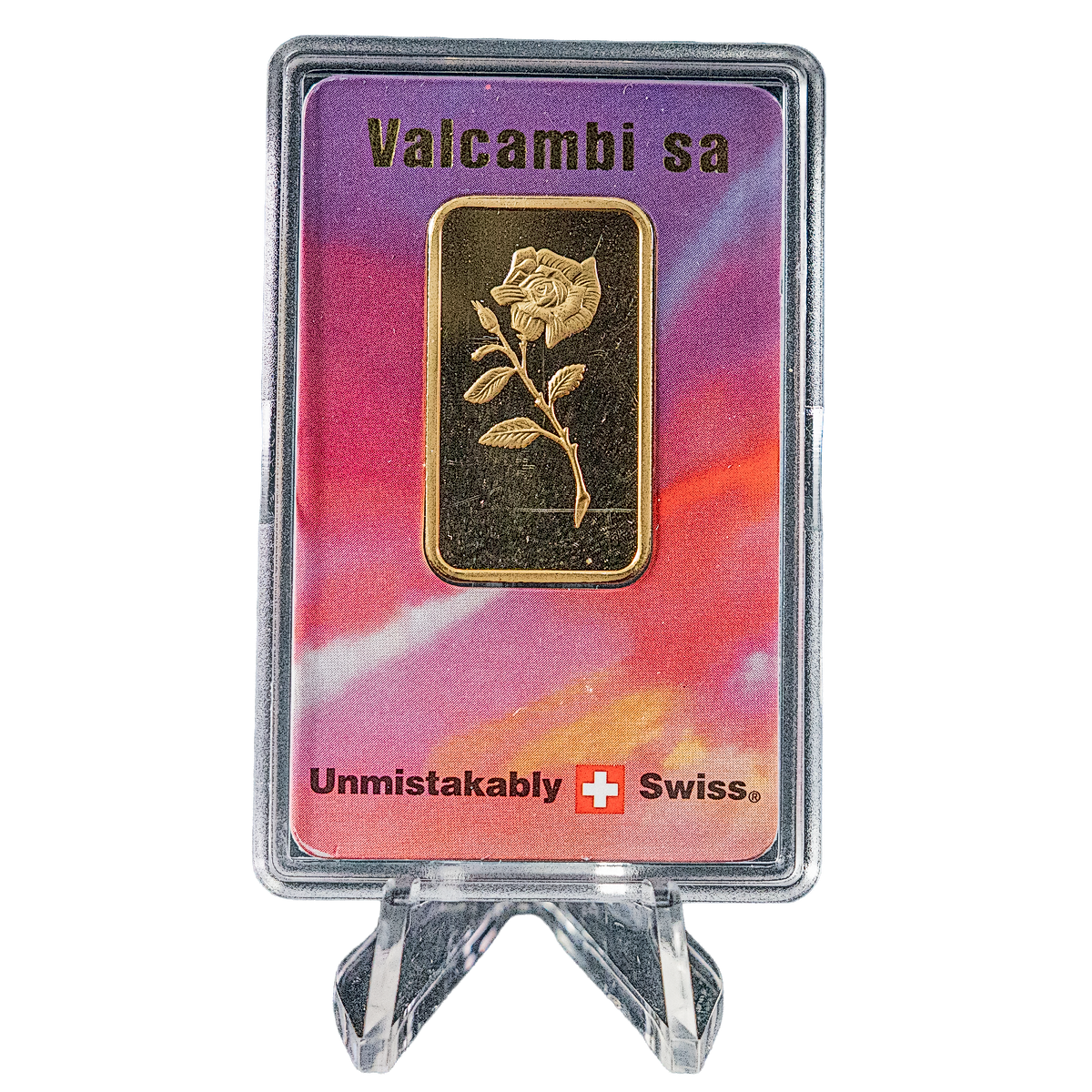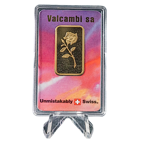 Valcambi Suisse gold bars are refined to the purity of 99.99% fine gold. Each bar has its weight, in this case 23.328 gram and the fineness 999.9% stamped on the obverse of the gold bar.