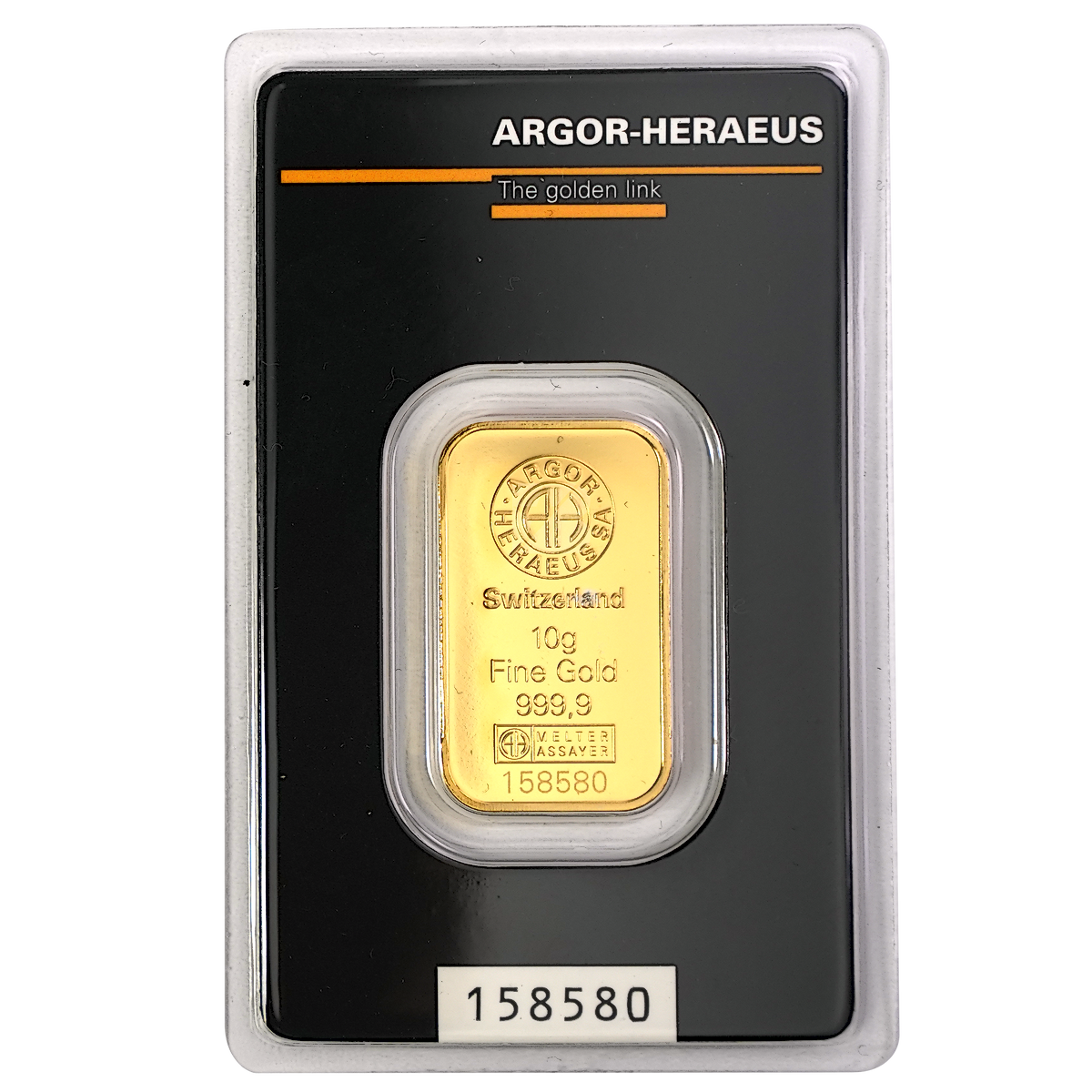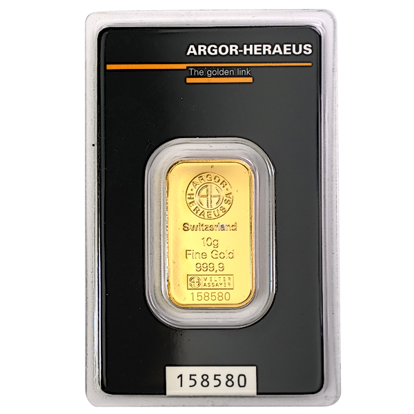 The front of the 10 gram gold bar is stamped with the Argor Heraeus refiner stamp ‘AH’, the words ‘Switzerland’, the bar’s weight and fine gold content, and a unique serial number.