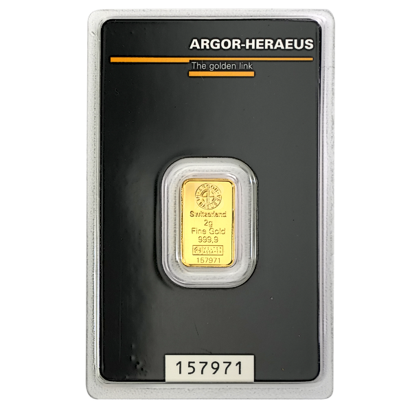 As a small investment gold bar, the Argor-Heraeus 2 gram minted gold bar is ideal for beginning to save in physical gold and is also ideal for gift giving.