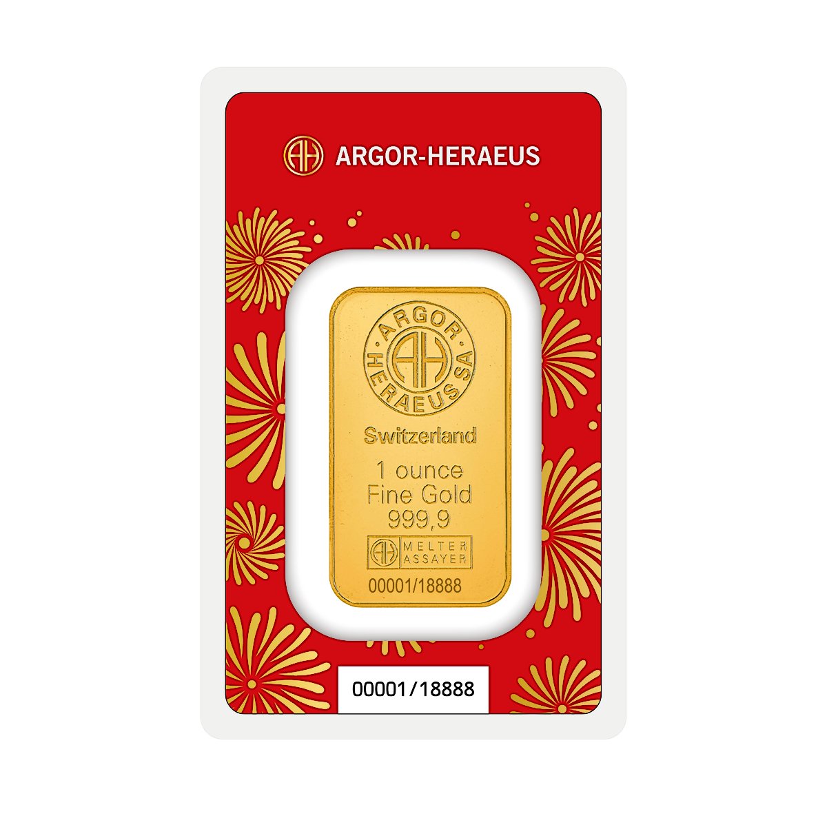 The front of the 1 oz gold bar is embossed with the famous Argor-Heraeus refinery stamp which consists of an 'AH' motif encircled by the words 'ARGOR HERAEUS SA', The front surface also contains the refinery location 'Switzerland', the bar's weight and fine gold content, '1 ounce Fine Gold 999.9', and the bar's unique serial number and Assay stamp.