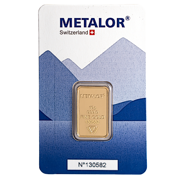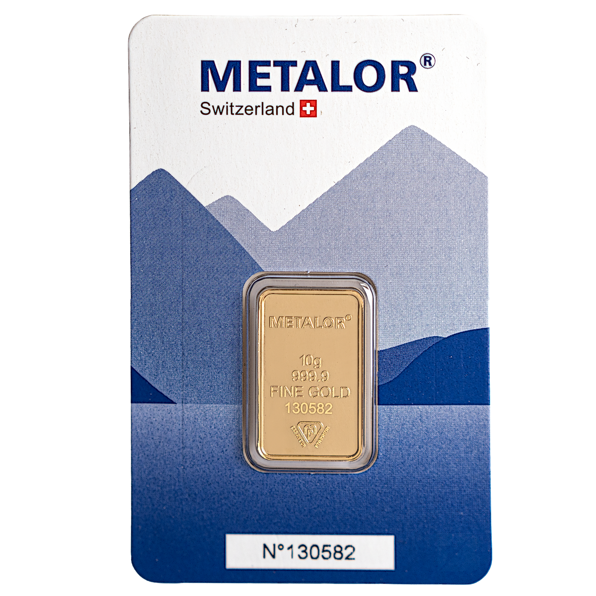 10 gram Gold bar minted by Metalor, a world renowned precious metals refinery based in Switzerland.