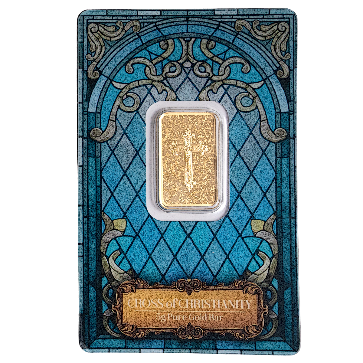 5 g Gold Christian Cross Gold Proof Bar minted by PAMP.