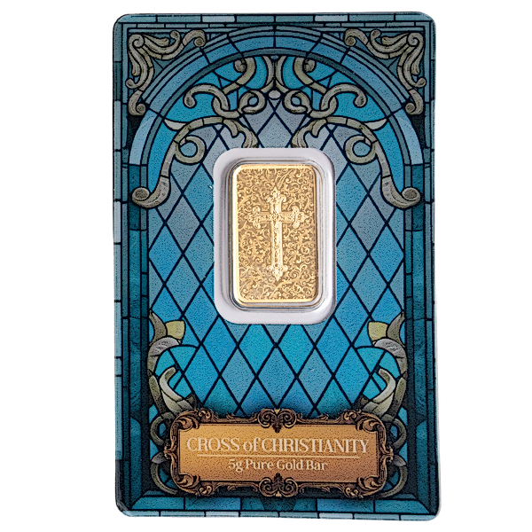 The Christian Cross, a symbol of faith, hope, and enduring strength is depicted on this 5 Gram Gold Bar by PAMP