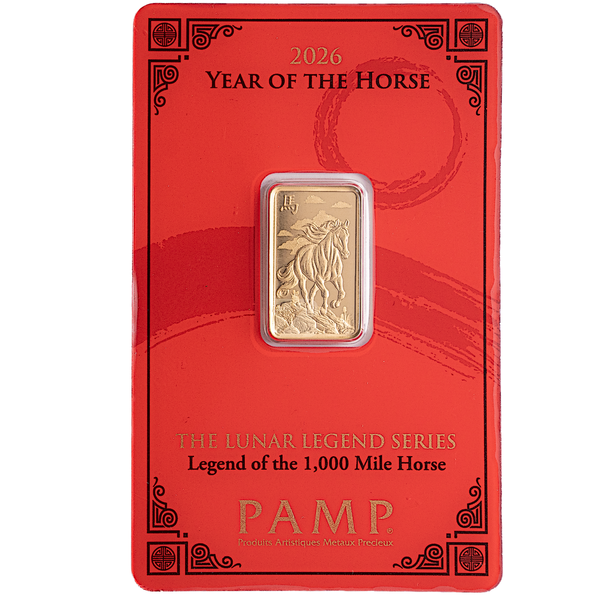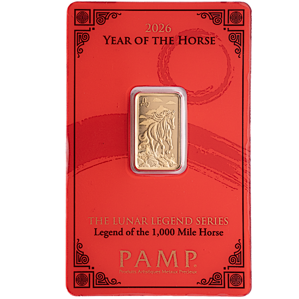 The 5 gram minted gold bar from the famous Swiss gold refinery PAMP is a great way to celebrate the 2026 Chinese Lunar 'Year of the Horse'.