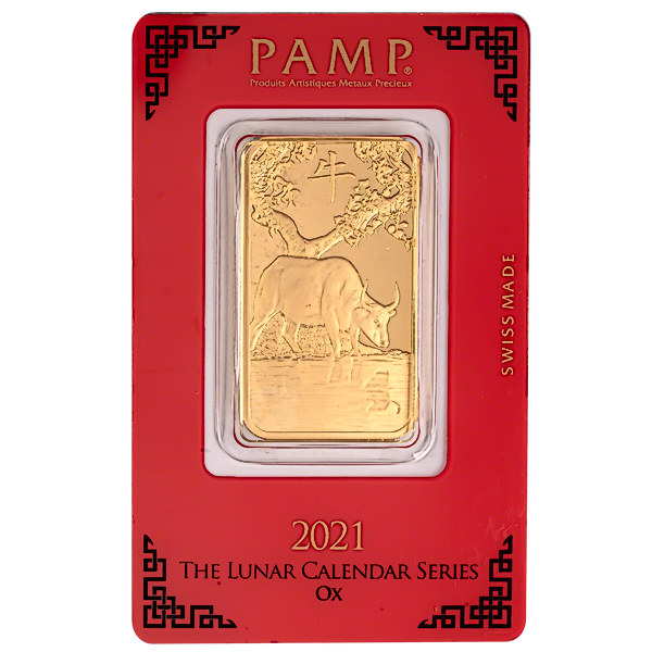 The 1 oz minted gold bar from the famous Swiss gold refinery PAMP is a great way to celebrate the 2021 Chinese Lunar 'Year of the Ox'.
