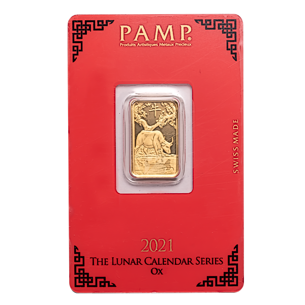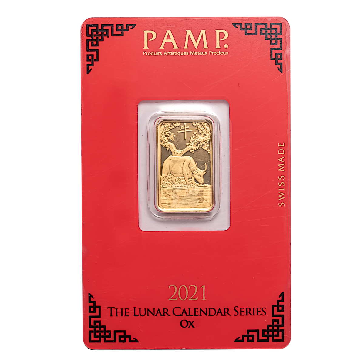 The 5 gram minted gold bar from the famous Swiss gold refinery PAMP is a great way to celebrate the 2021 Chinese Lunar 'Year of the Ox'.