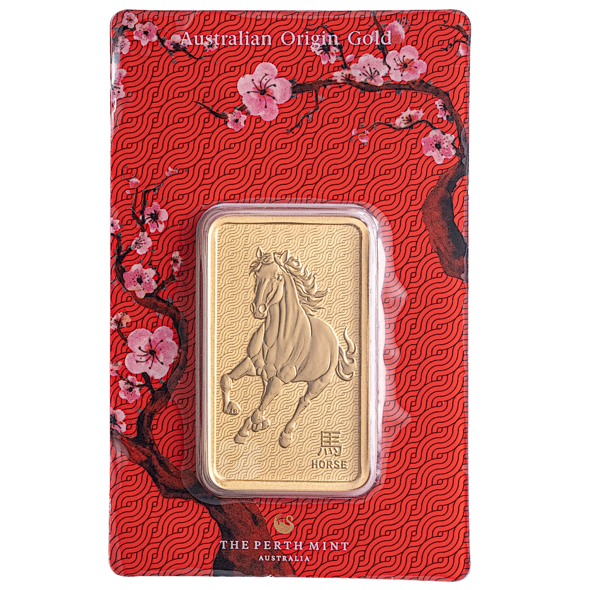 1 oz Lunar Horse minted bullion bar encased in a red packaging featuring the cherry blossom flower. Red signifies good luck in Chinese culture and the cherry blossom flower is an iconic flower that indicates the coming of Spring.