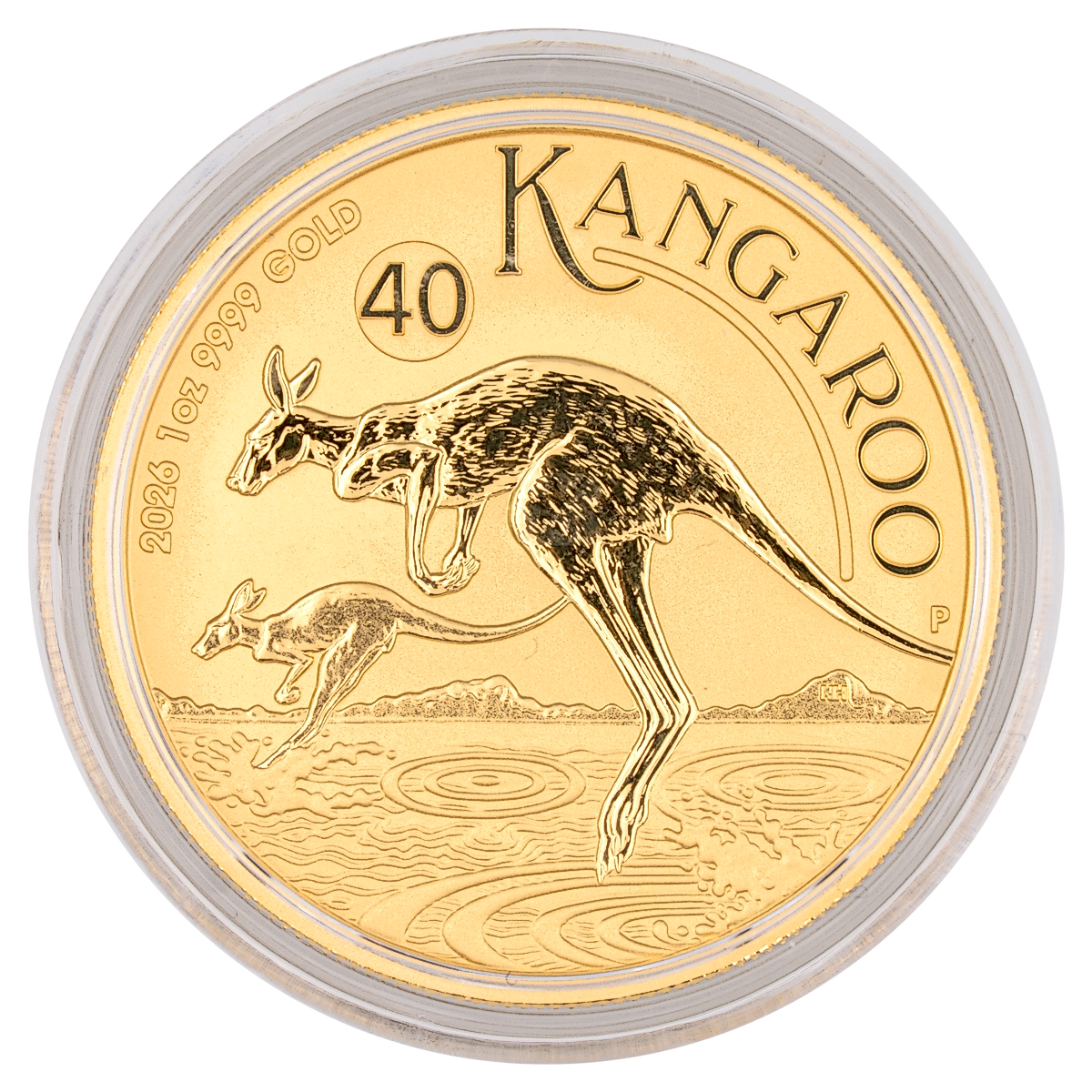 The obverse of the 2026 1 oz Gold Kangaroo coin features two large kangaroos leaping through shimmering waters. The inscription "KANGAROO," the 2026 year-date and The Perth Mint’s "P" mint mark is included in the design. A privy mark with the number "40" commemorates the 40th anniversary of the Australian Nugget.
