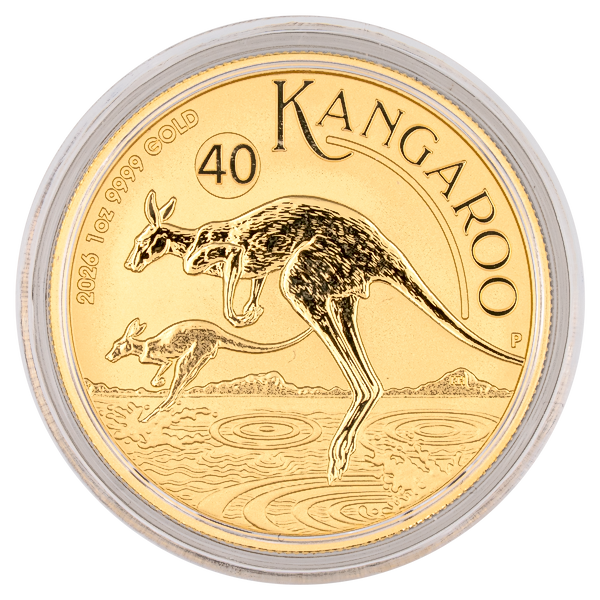 This 2026 1 oz Gold Kangaroo is a gold bullion coin produced by Australia's Perth Mint. Each coin weighs 1 troy ounce and has a gold purity of 99.99%.