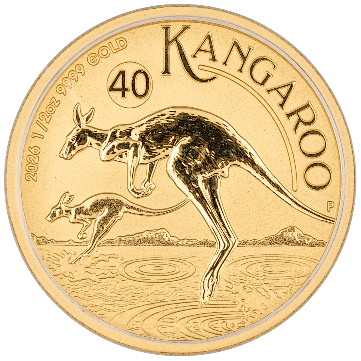 The obverse of the 2026 1 oz Gold Kangaroo coin features two large kangaroos leaping through shimmering waters. The inscription "KANGAROO," the 2026 year-date and The Perth Mint’s "P" mint mark is included in the design. A privy mark with the number "40" commemorates the 40th anniversary of the Australian Nugget.