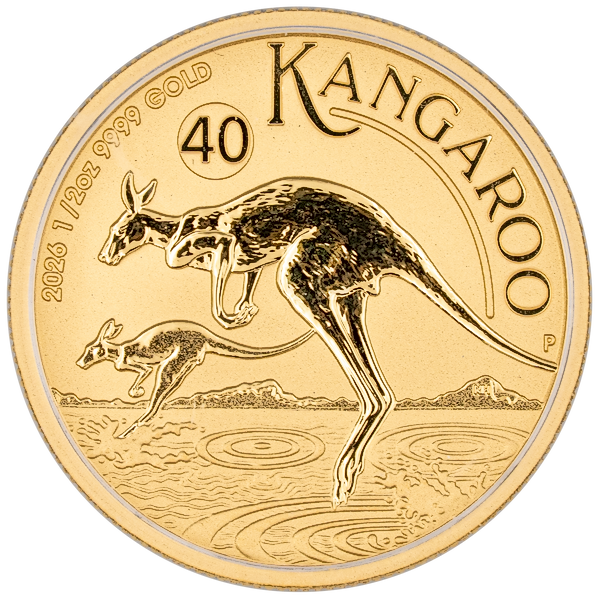 This ½ troy ounce Gold Kangaroo coin is produced by Australia's Perth Mint and has a gold fineness of 0.9999.