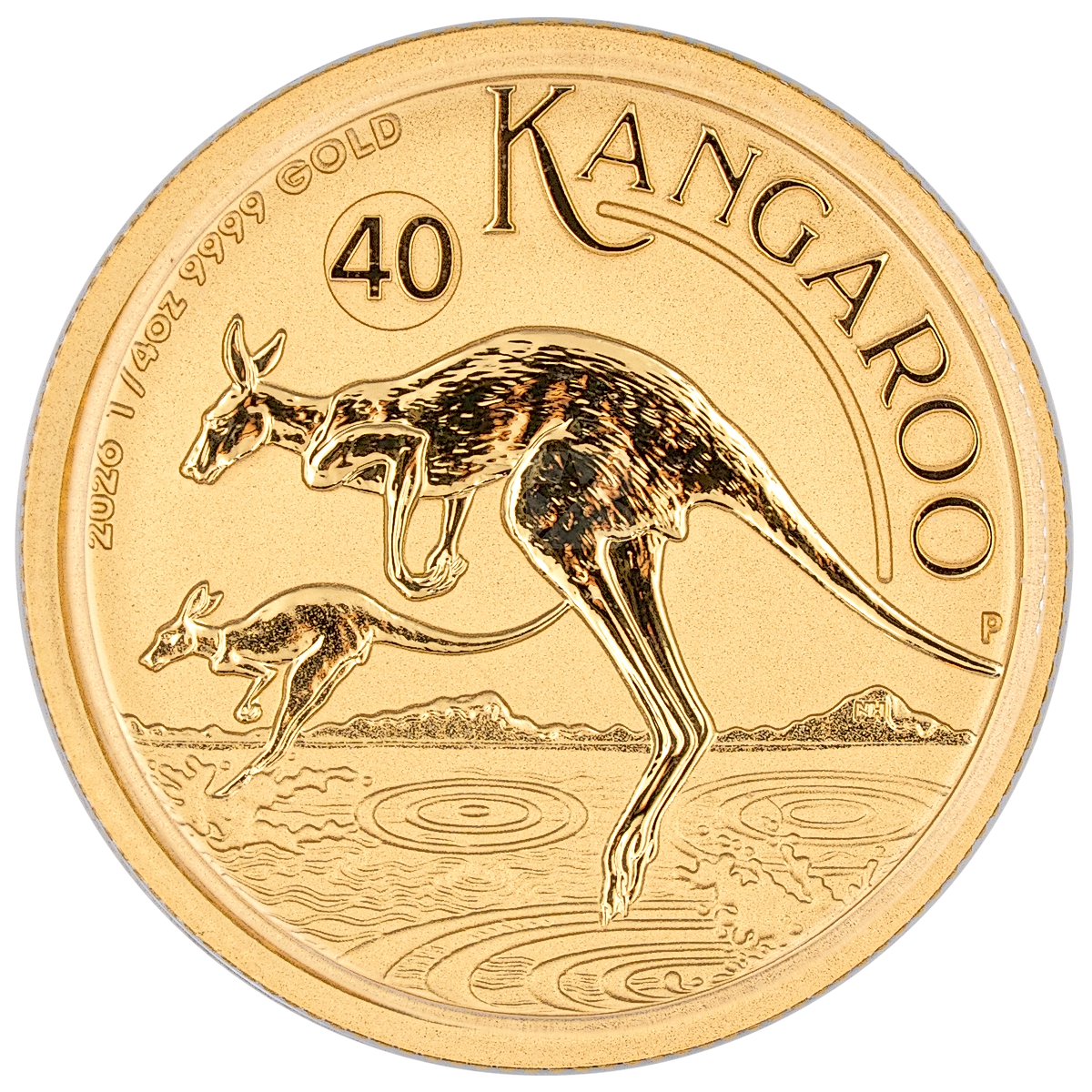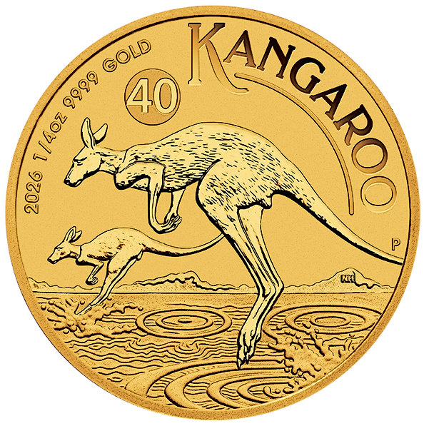 This 2025 1/4 oz Kangaroo gold bullion coin from Australia's Perth Mint has a gold fineness of 0.9999 and weighs exactly 0.25 troy ounces.