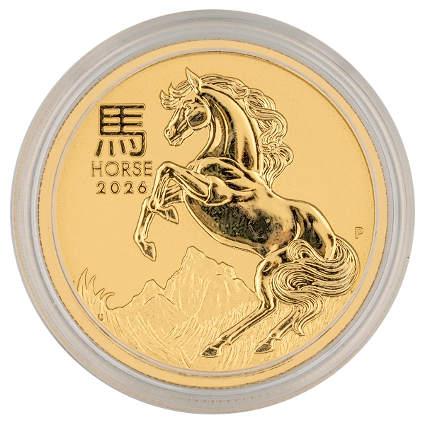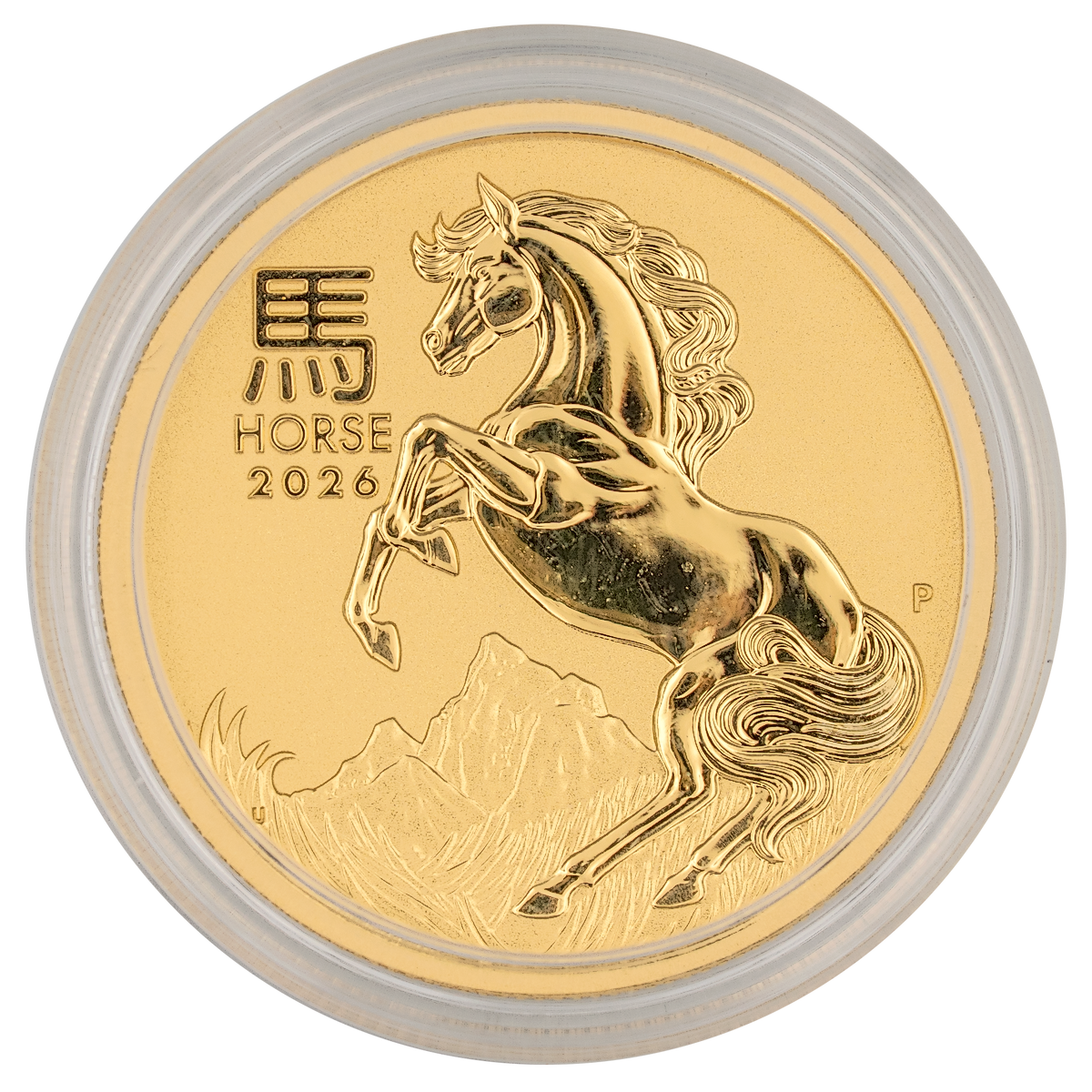 This 1/2 oz gold bullion coin from Australia’s Perth Mint is minted in 99.99% pure gold and celebrates the Lunar Year of the Horse for 2026.