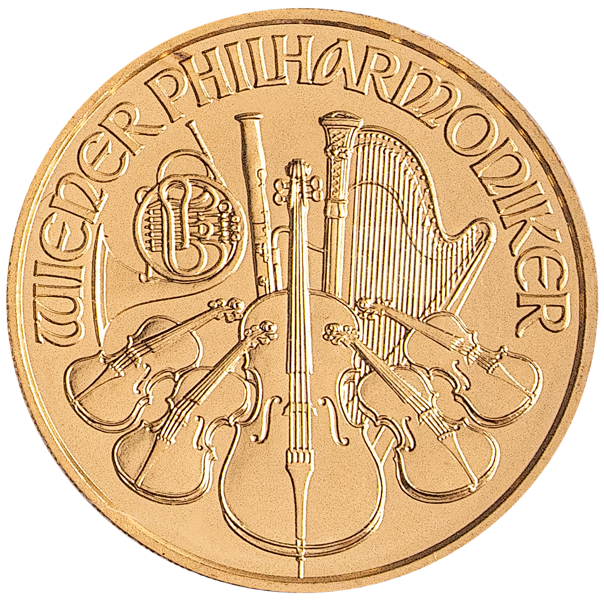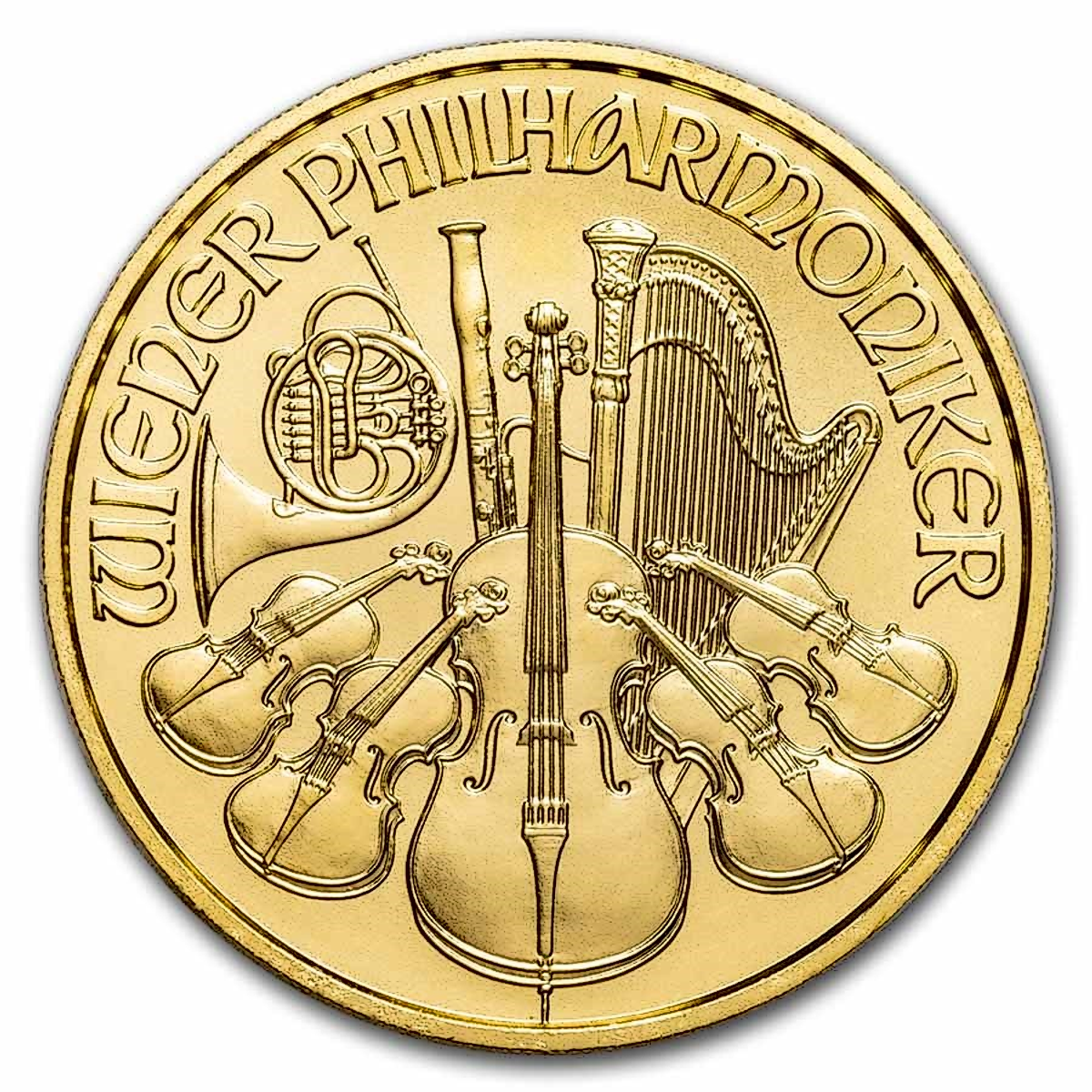 The Wiener Philharmoniker or Vienna Philharmonic Gold Coin has been produced since 1989. The coin depicts the famed Vienna Philharmonic Orchestra.