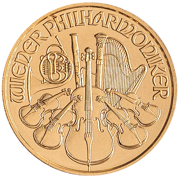The Gold Philharmonic is generally minted in the sizes of 1/10 oz, 1/4 oz, 1/2 oz and 1 oz.