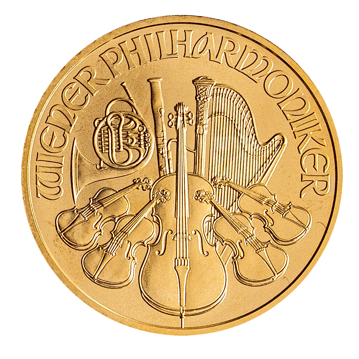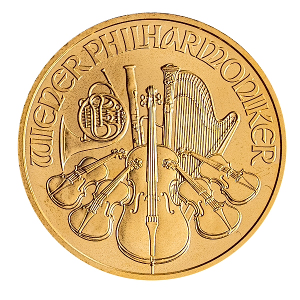 The Wiener Philharmoniker or Vienna Philharmonic Gold Coin has been produced since 1989. The coin depicts the famed Vienna Philharmonic Orchestra.