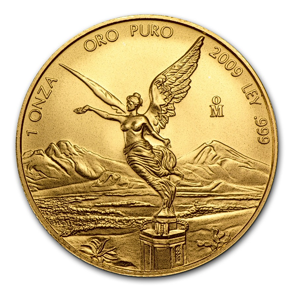 The obverse of the Mexican Libertad features Mexico's coat of arms, and the reverse shows an angel in the foreground, with volcanoes Popocatépetl and Iztaccihuatl in the background.