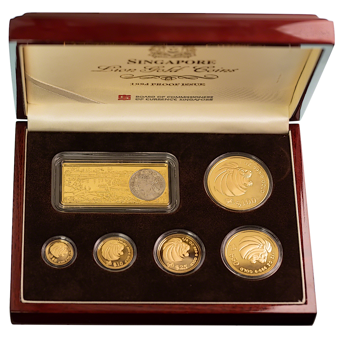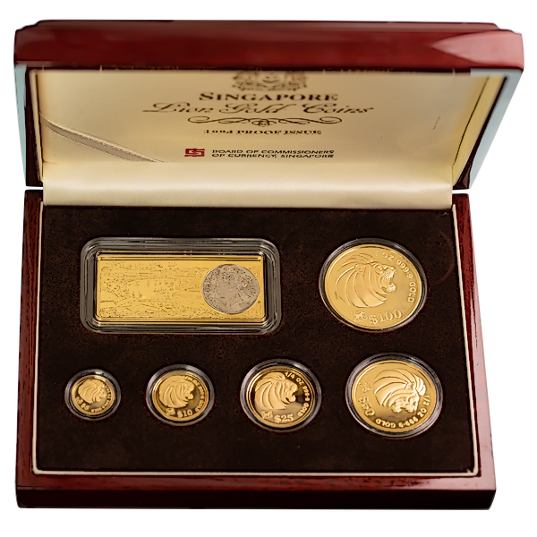 5 coin proof Singapore Gold Lion set minted by The Singapore Mint.