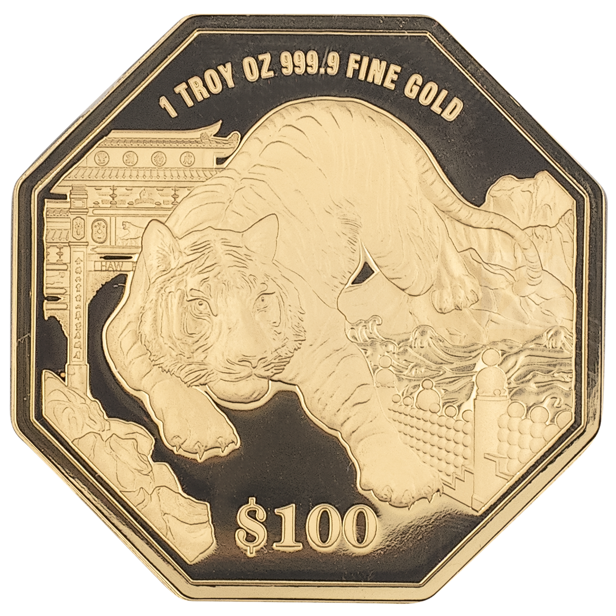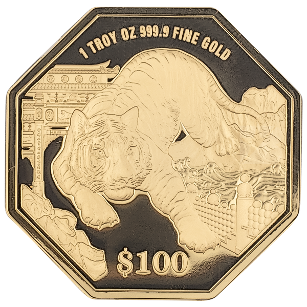 1 oz Octagon Lunar Tiger coin minted by the the Singapore Mint to celebrate the Year of the Tiger in 2022.