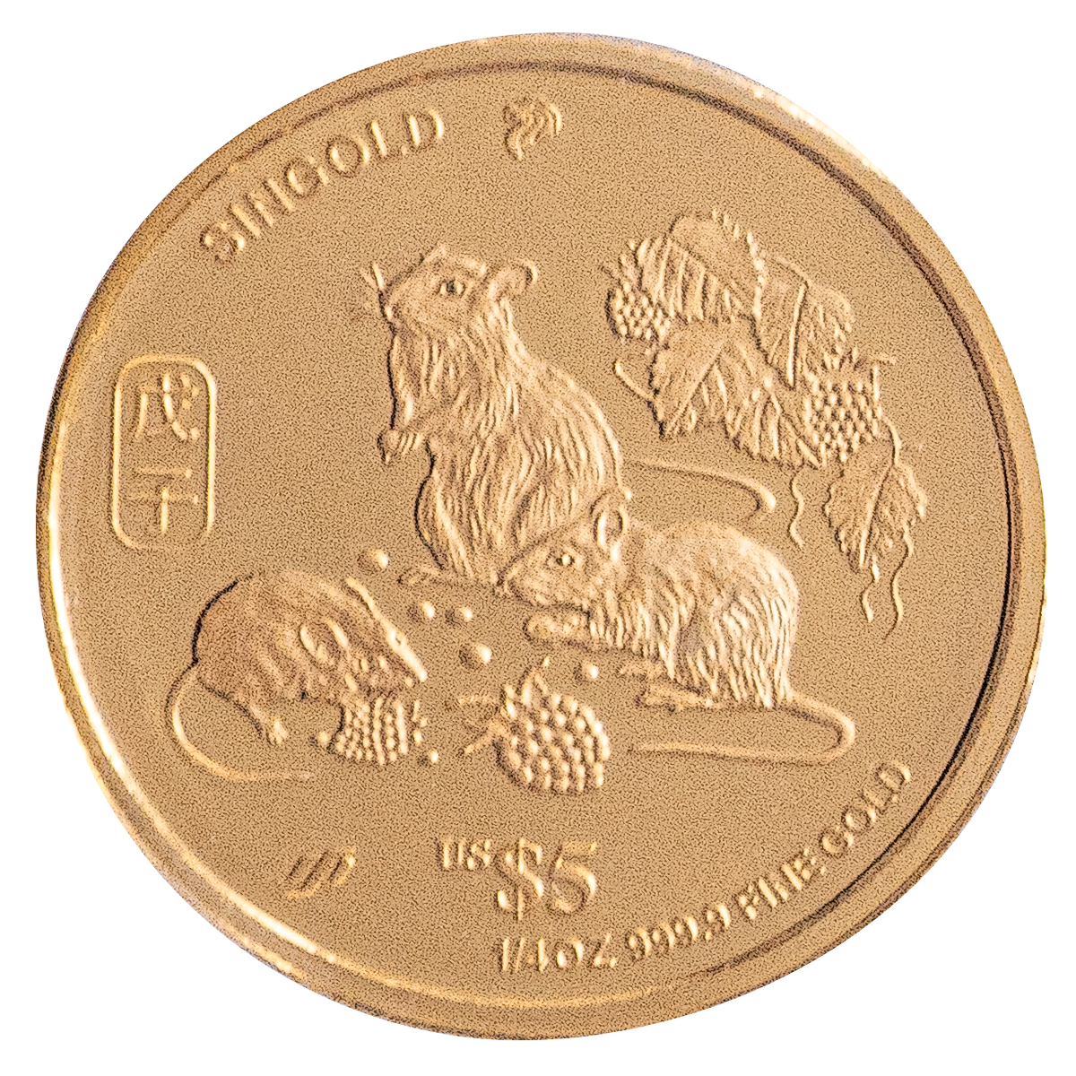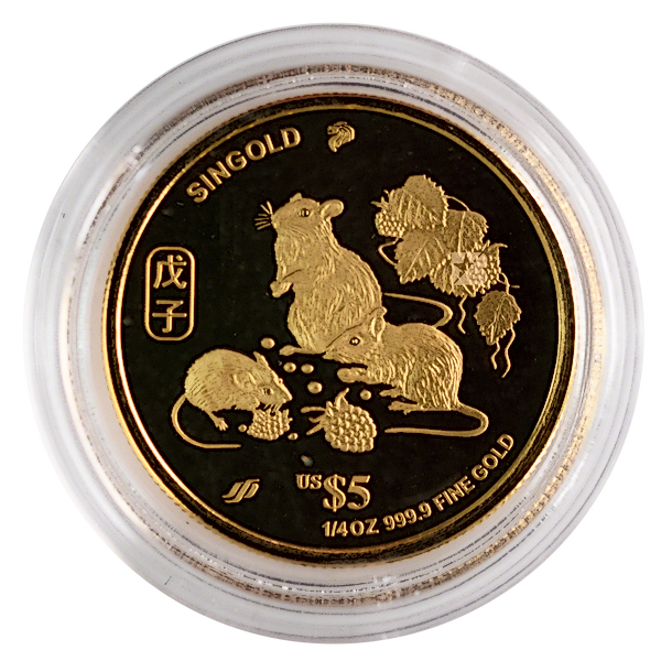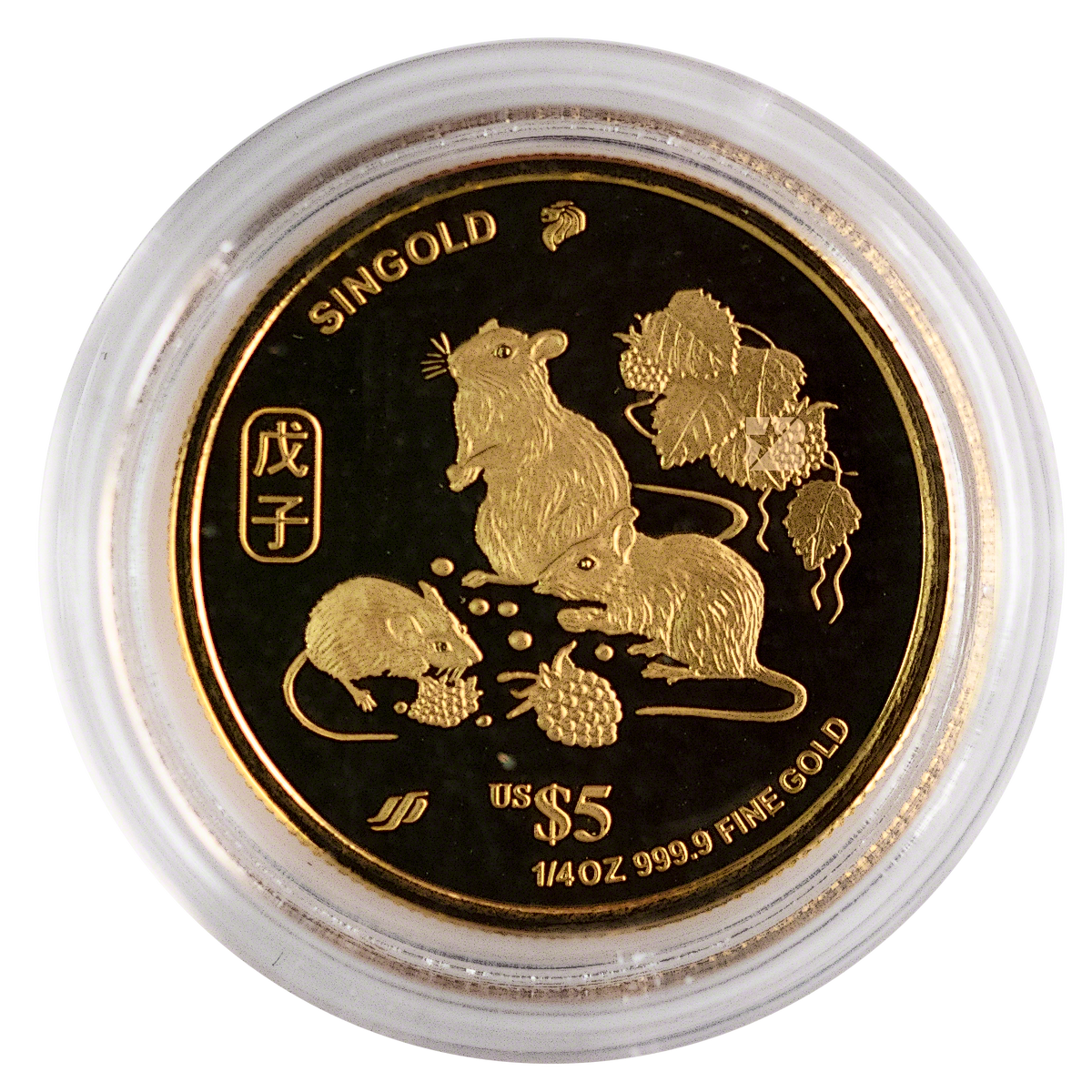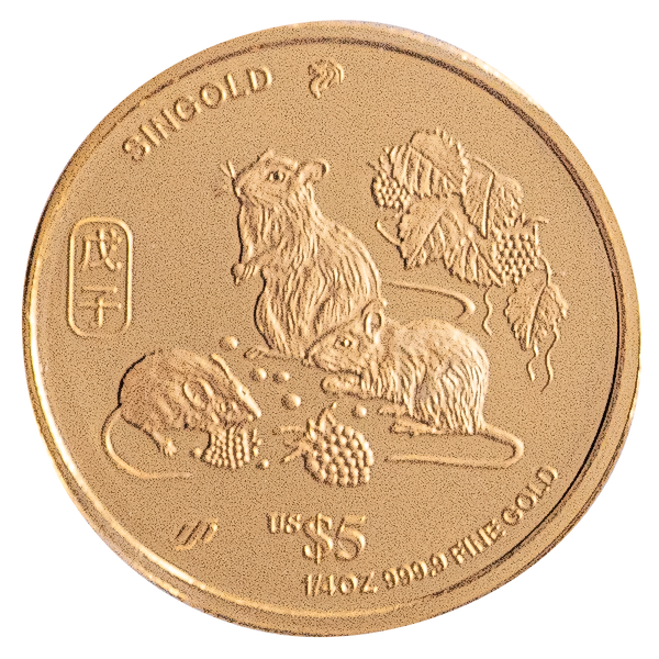 1/4 oz Singold Lunar Series Year of the Mouse Gold coin produced by Singapore Mint.