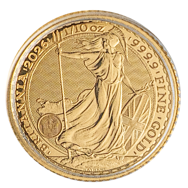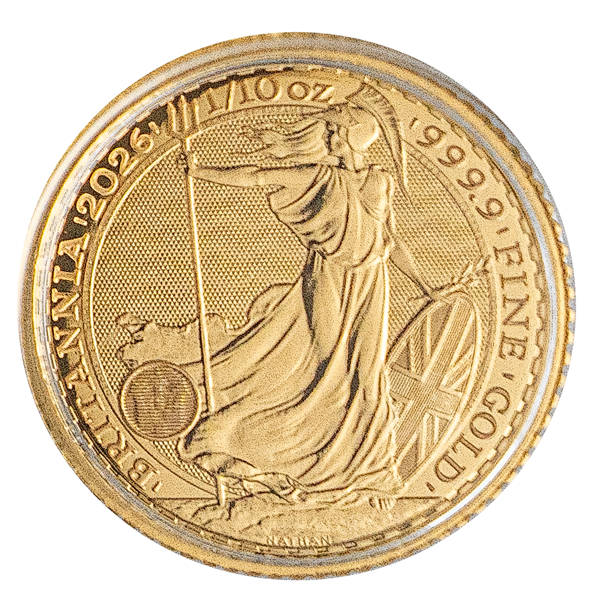 This 1/10 oz gold Britannia bullion coin for 2026 is minted by Britain’s national mint, The Royal Mint.