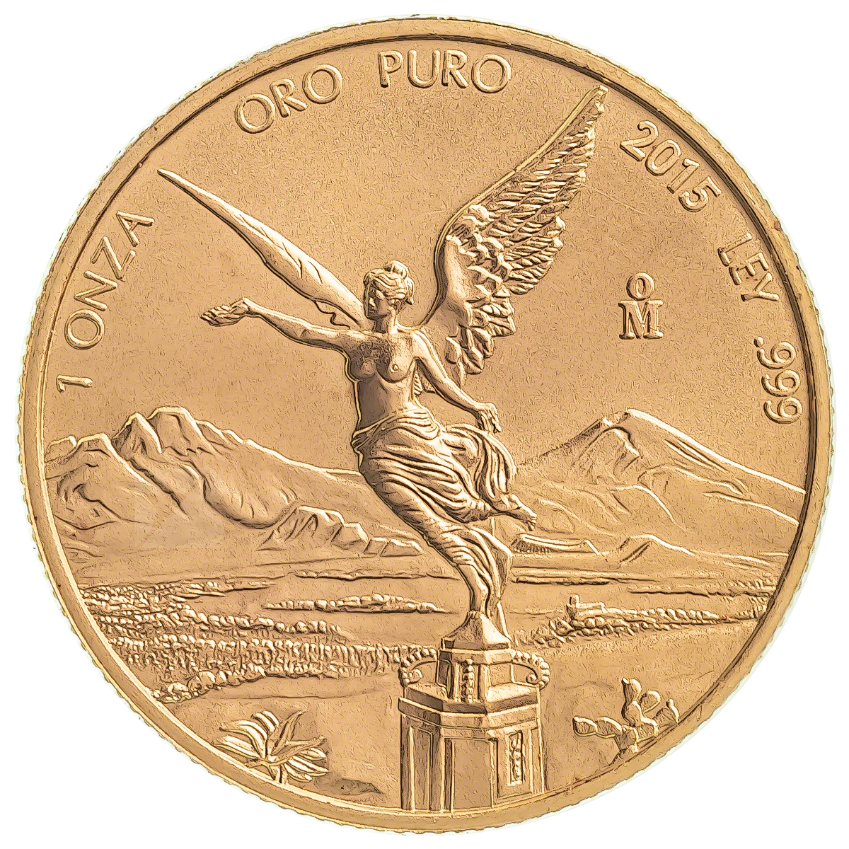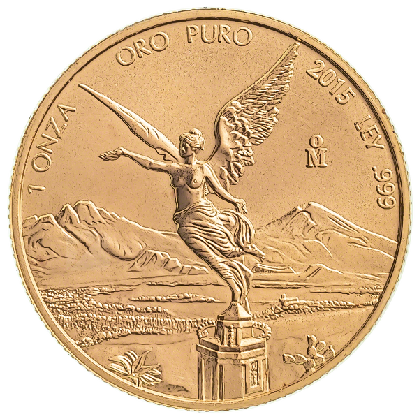 The obverse of the Mexican Libertad features Mexico's coat of arms, and the reverse shows an angel in the foreground, with volcanoes Popocatépetl and Iztaccihuatl in the background.