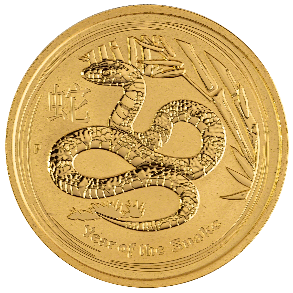 The reverse features a snake wrapped around a tree branch and bearing a striking scale pattern. "Year of the Snake" is imprinted along the bottom of the coin. The Perth Mint’s traditional ‘P’ mintmark is also inscribed on the left of the coin.