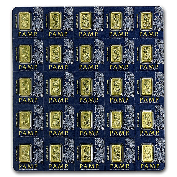 The reverse of each 1 gram gold bar is imprinted with the PAMP refinery logo with the words "SUISSE 1g FINE GOLD’ and the 'Essayeur Fondeur' Swiss assay mark. Together the 25 gold bars weigh 25 grams or 0.804 troy ounces.