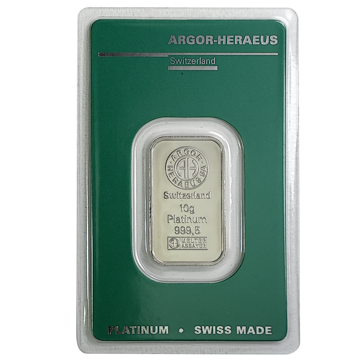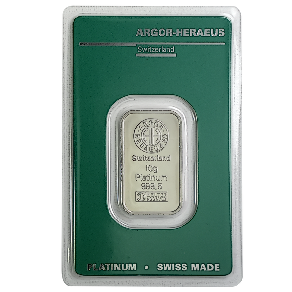 This high-lustre 10 grams minted platinum bar has a purity of 99.95% platinum and is fabricated in Switzerland at the Argor-Heraeus precious metals refinery in Mendrisio in the Swiss Canton of Ticino.