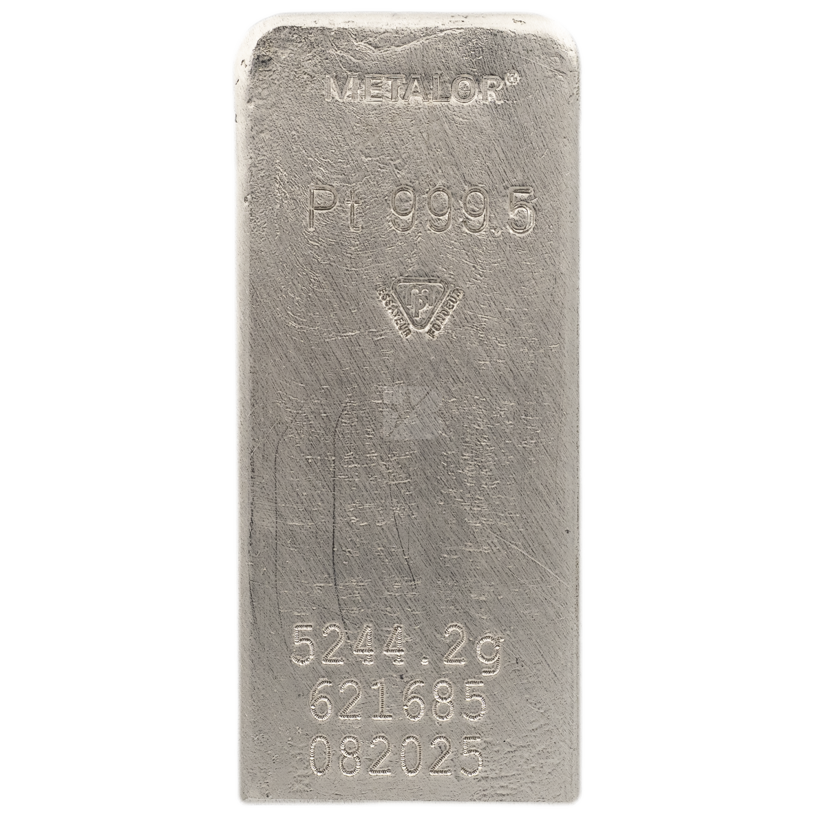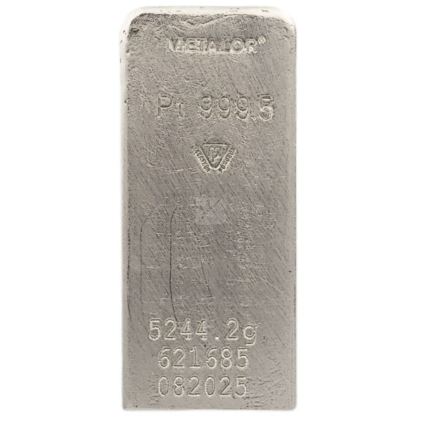 This 168.605 oz (5.244 kg) platinum bar is fabricated by the Metalor.