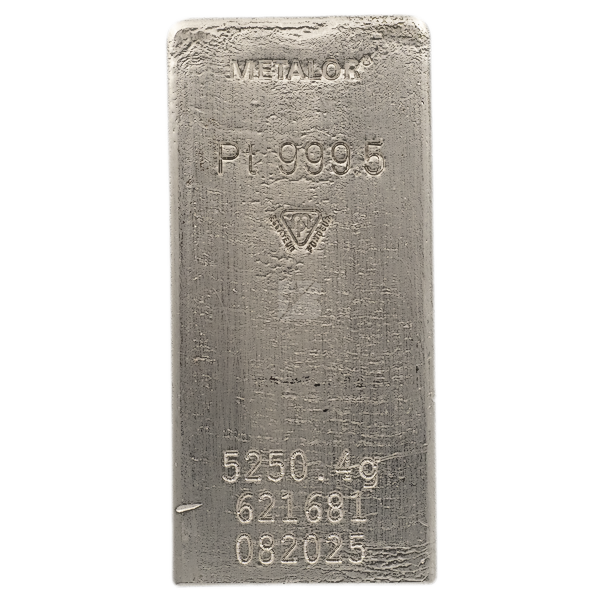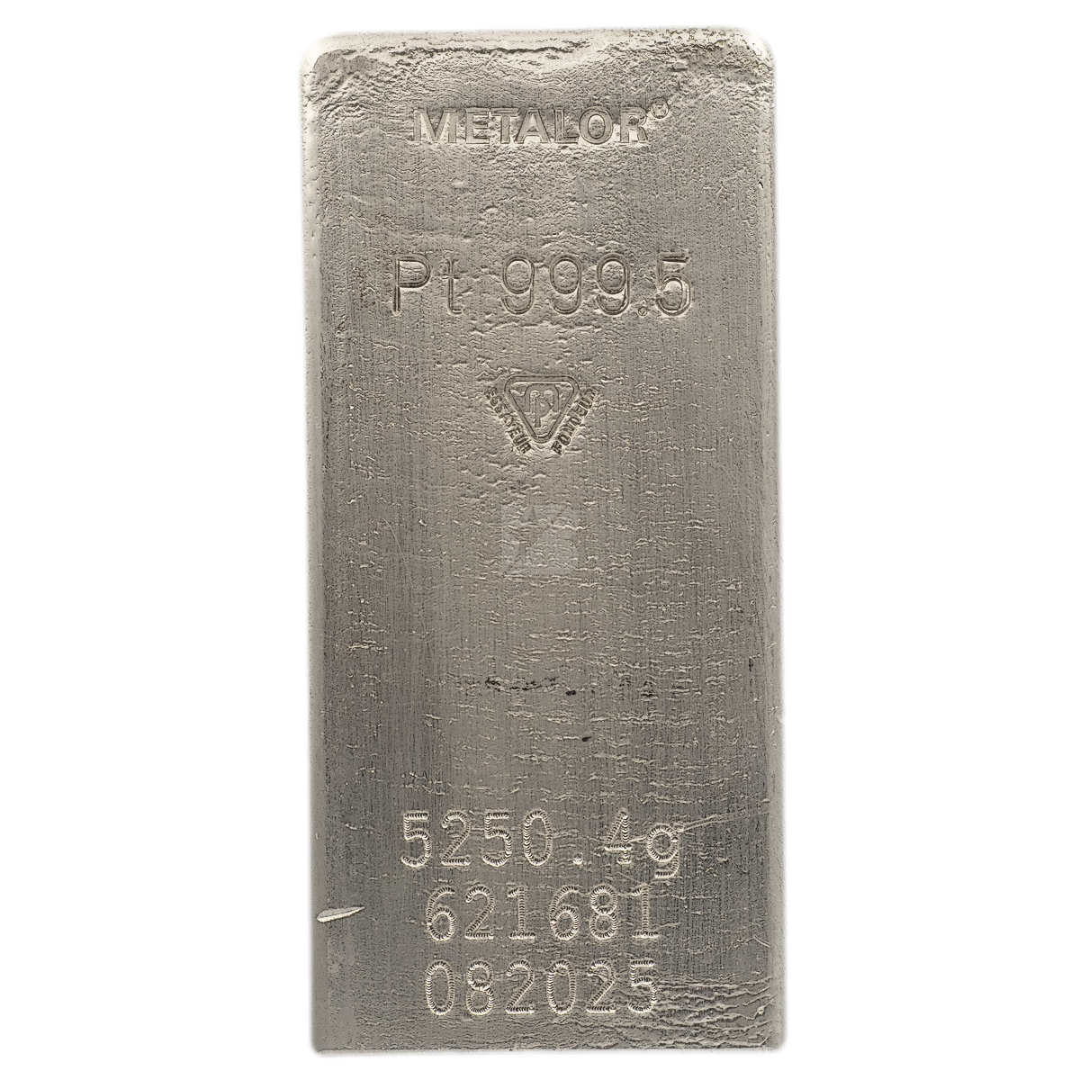 This 168.804 oz (5.2504 kg) platinum bar is fabricated by the Metalor.