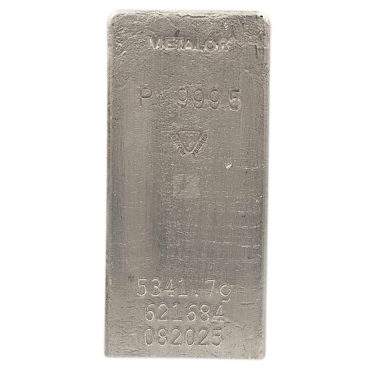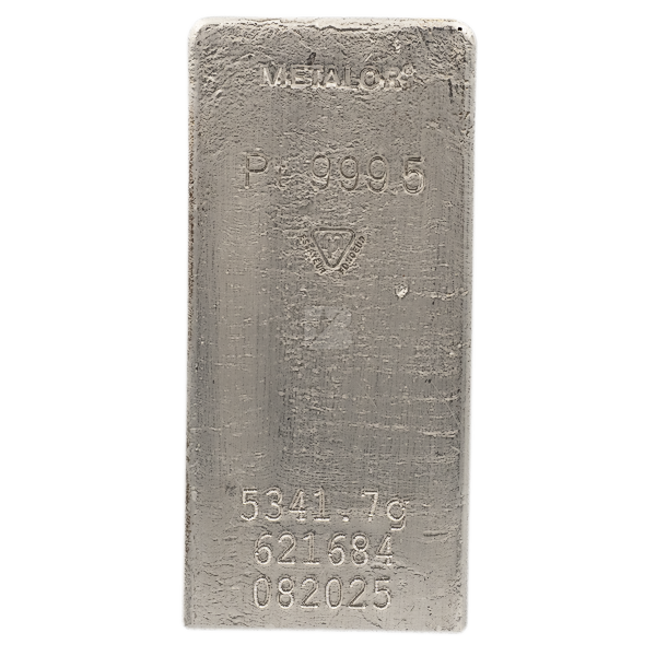 This 171.740 oz (5.341 kg) platinum bar is fabricated by the Metalor.