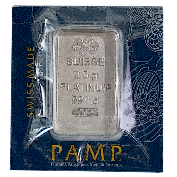 PAMP’s 2.5 gram platinum bar is a 99.95% purity platiunum bar minted in Switzerland. PAMP is one of the world’s best known and most prestigious preciouis metals refineries, so when saving in platinum, PAMP platinum bars are a popular choice.