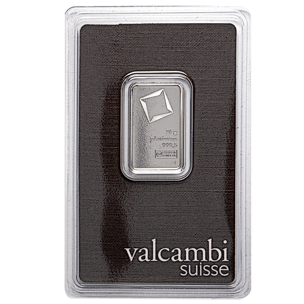 The front surface of the bar displays Valcambi’s refinery logo, a diamond comprising four scalene triangles, the bar’s weight and platinum purity, and the bar’s unique serial number.