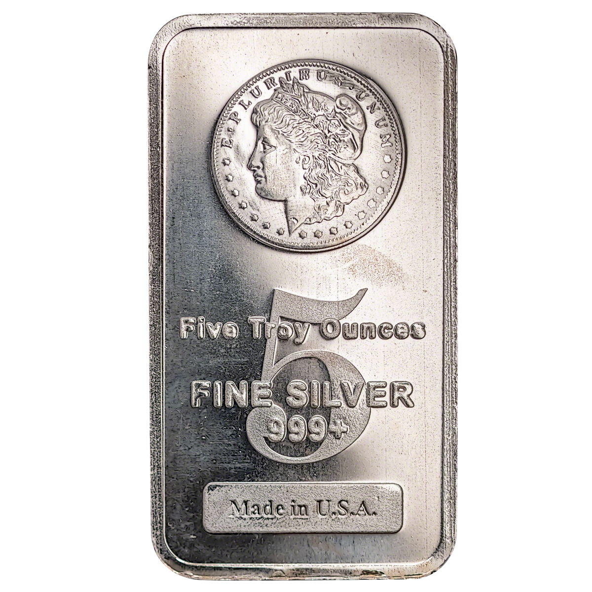 The front of the bar features a raised image of the famous Morgan silver dollar coin which was designed by George T Morgan in 1878.
