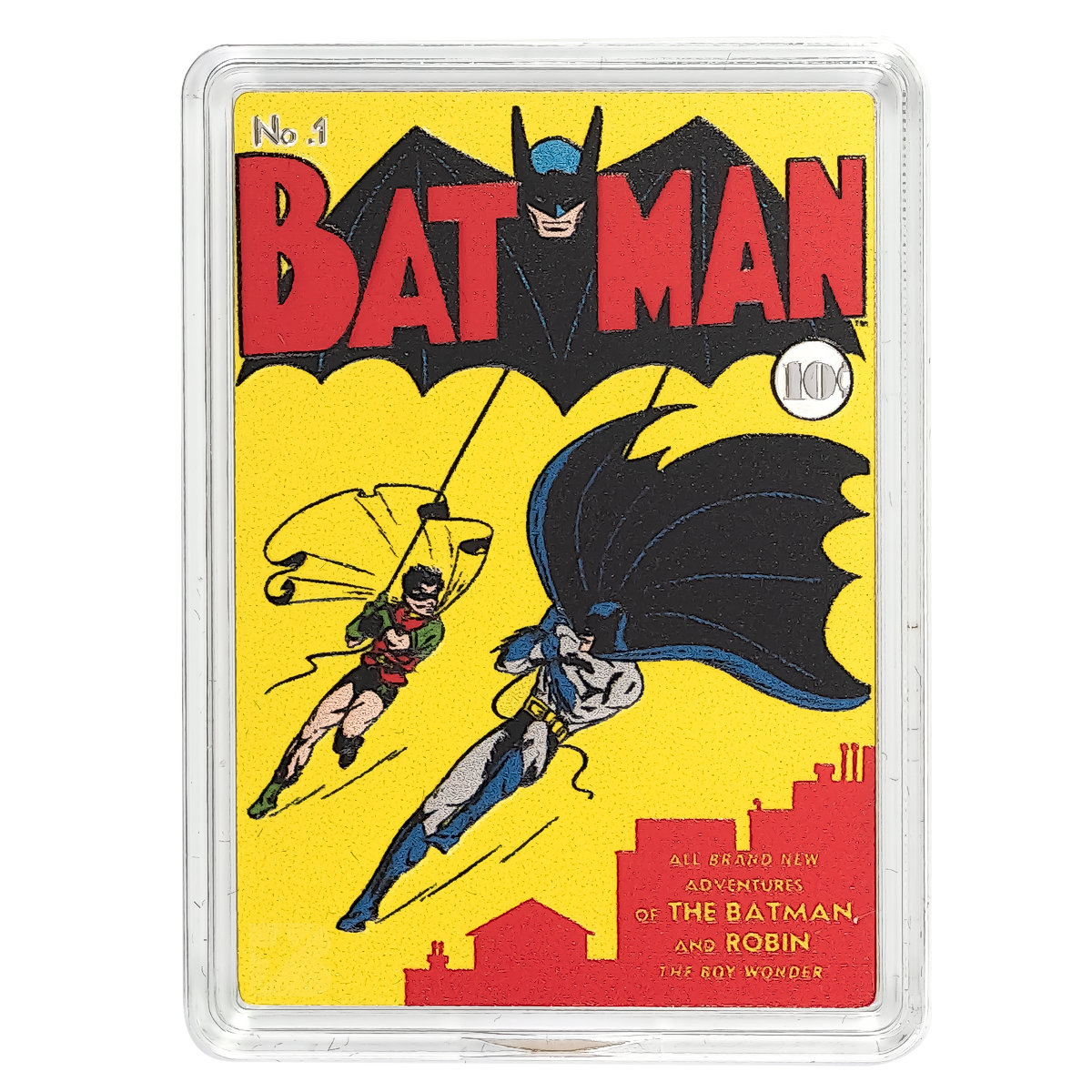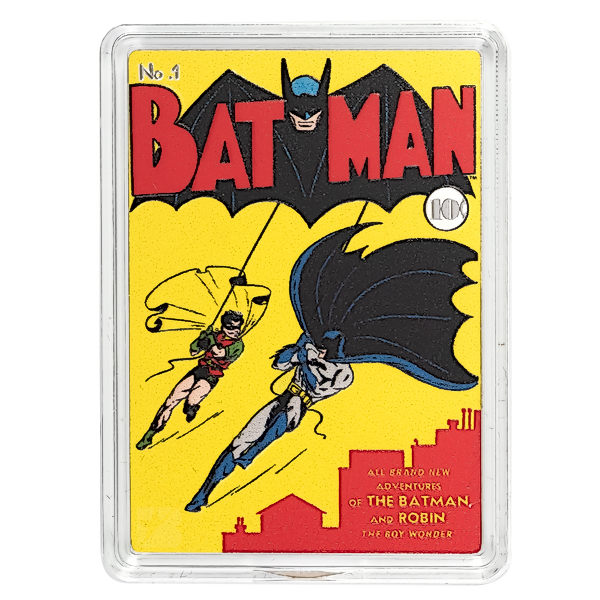 The first comic dedicated to BATMAN™ — Batman #1 stands out on 1oz silver! This superb coin displays a coloured image of the cover of the Batman #1 comic from March 1940. To mimic the comic book, it is crafted into a rectangular shape and coloured on all four sides to represent the spine and pages! As legal tender, the obverse displays the Public Seal of Niue.