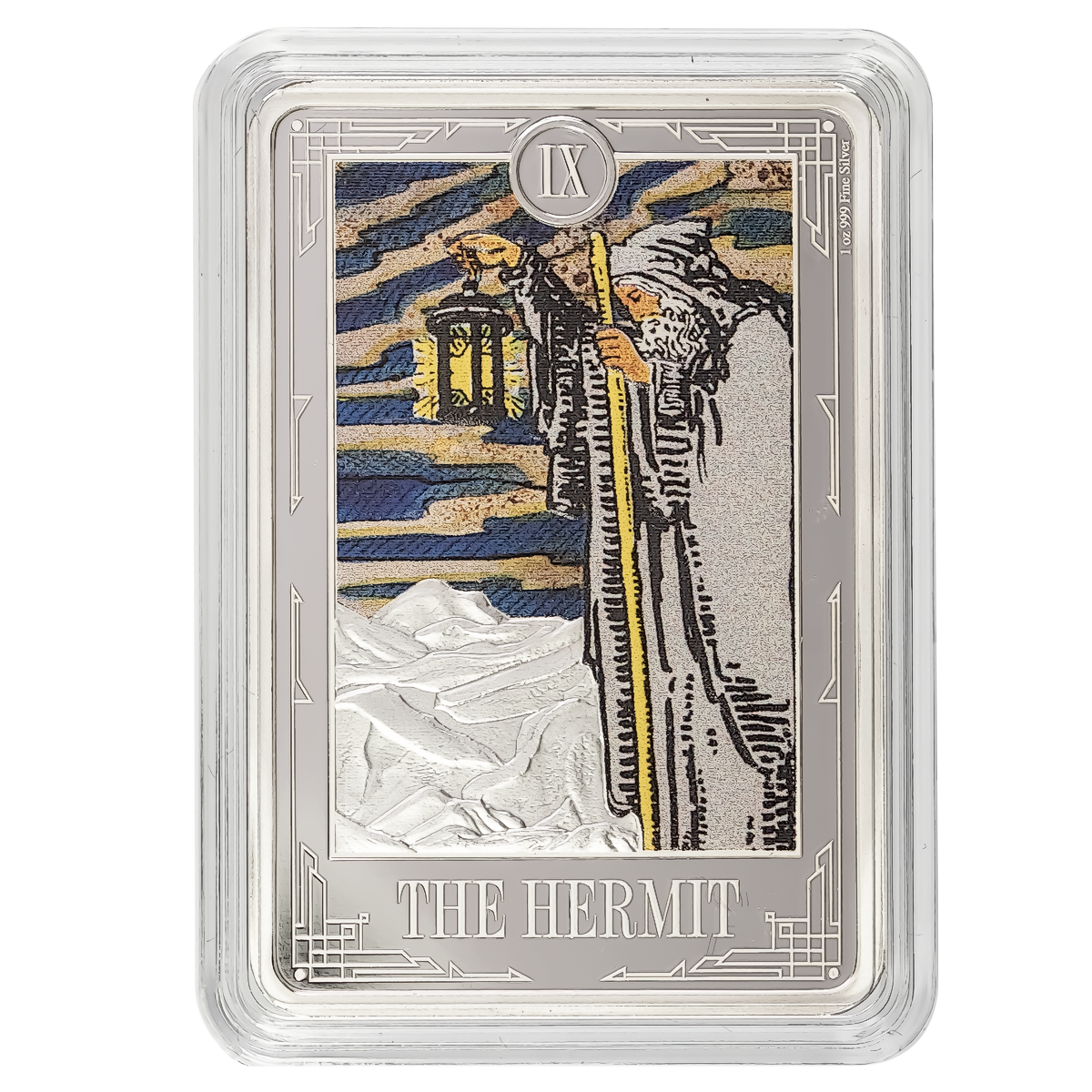 The Hermit features the tenth release in the Tarot Card coin collection struck in 1 oz of Silver. The Hermit card is numbered ten in the emblematic tarot cards known as Major Arcana. The card encourages us to take careful examination of our lives.