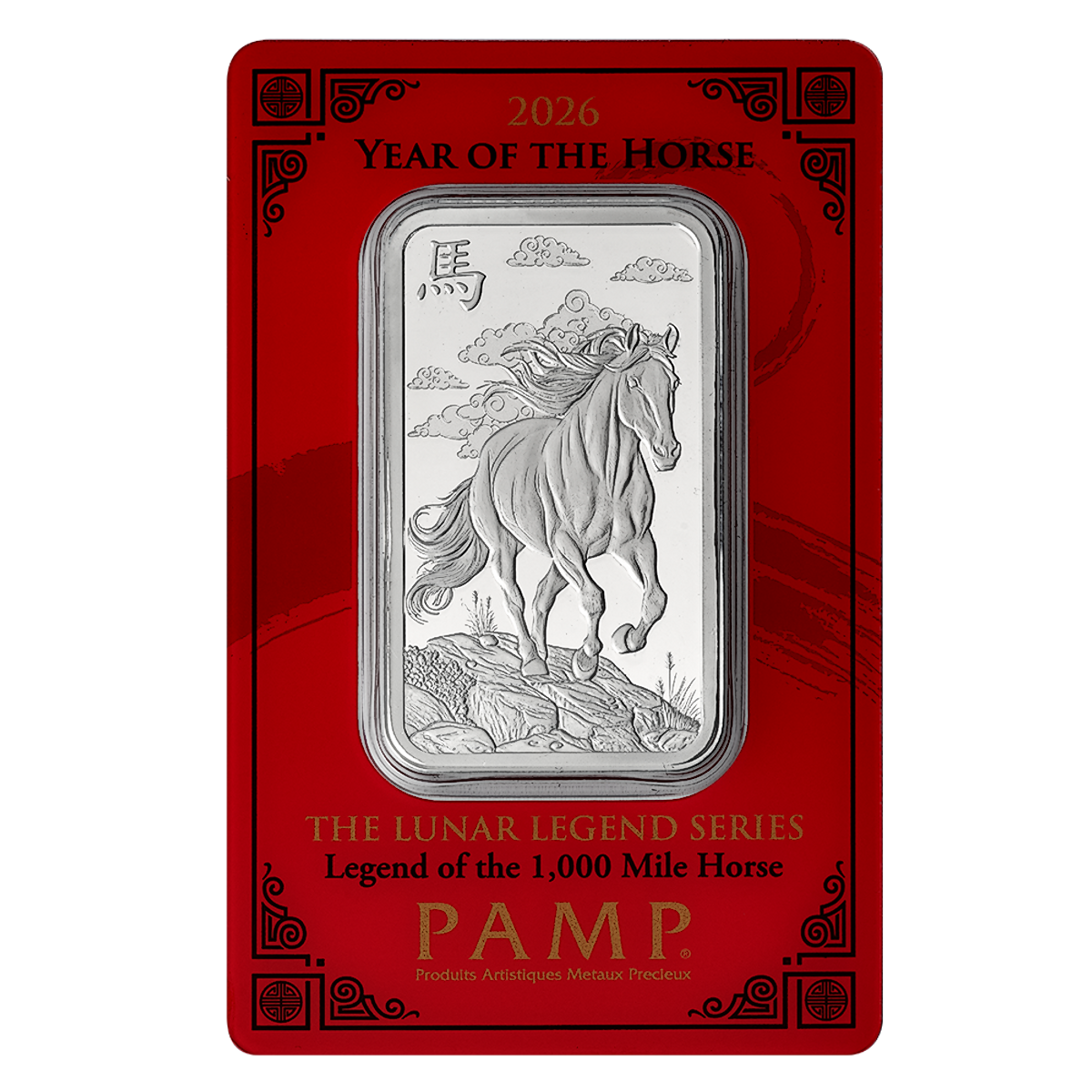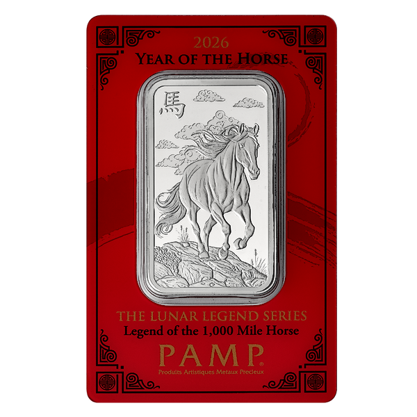 The 1 oz minted silver bar from the famous Swiss refinery PAMP is a great way to celebrate the 2026 Chinese Lunar 'Year of the Horse'.