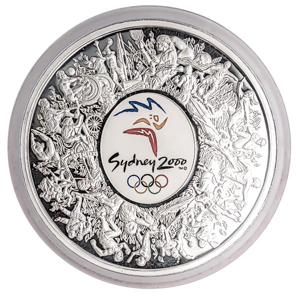 The reverse of the coin features the official Sydney 2000 Olympic Games logo in color, surrounded by images depicting all twenty-eight sports of the Games. The top half of the coin is edge lettered with the words Games of the XXVII Olympiad, and the lower half carries the edge lettering 1 Kilo .999 fine Silver. The Millennium Athlete also appears on the left and right edges of the coin.