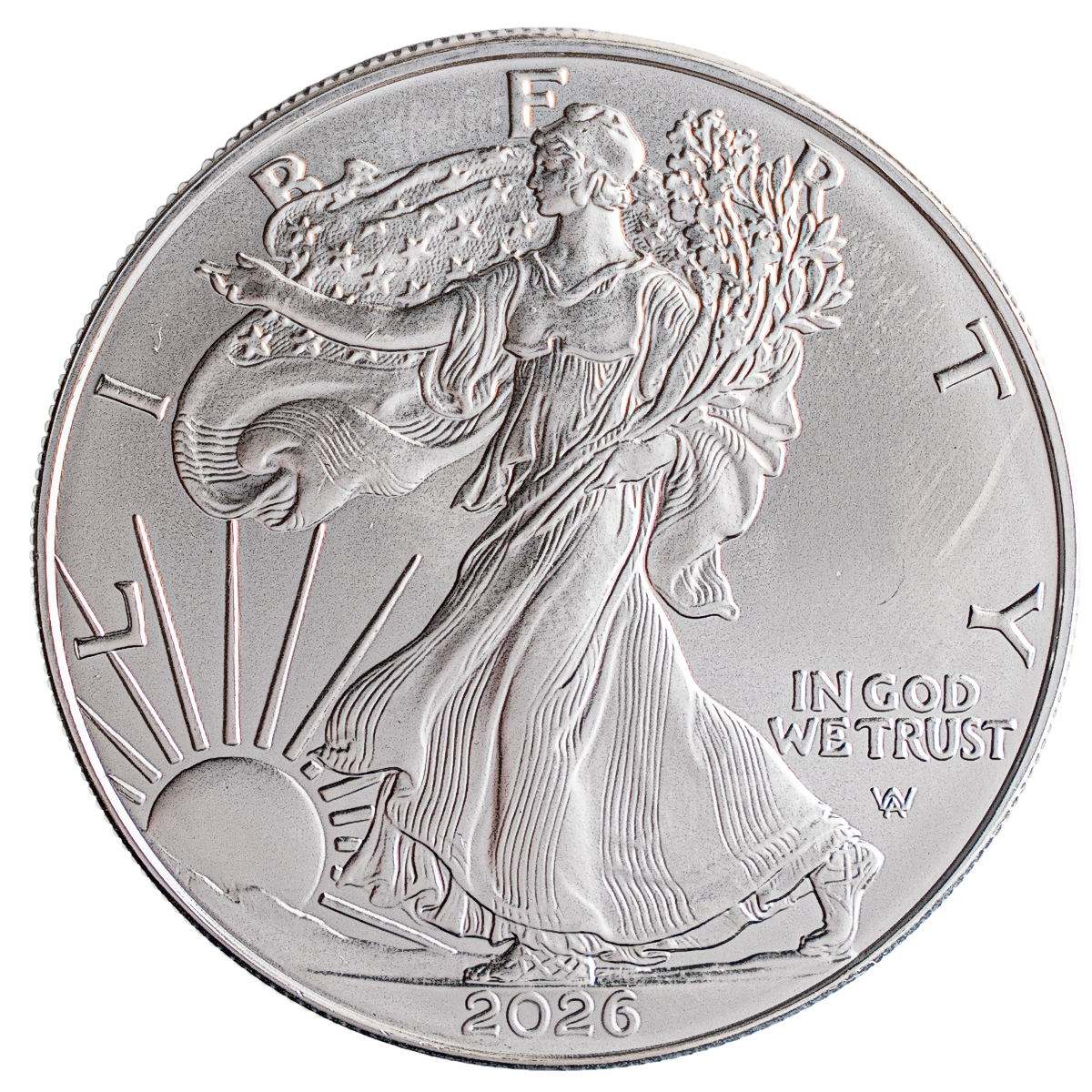 The obverse of the coin features a stylized depiction of the goddess Liberty based on Adolph A. Weinman's 1916 "Walking Liberty" half dollar, and is imprinted with the word “LIBERTY”, the words “IN GOD WE TRUST” and the year 2026.