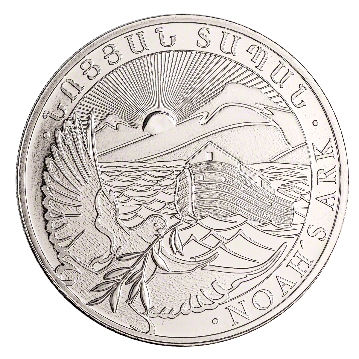 The reverse of the coin features a depiction of the Ark. In the background of the design you will see Mount Ararat, where the journey of Noah and his ark ended. Mount Ararat was a part of Armenia until the 20th century and after the first world war, when the country was divided between the Soviet Union and Turkey, Mount Ararat was given to Turkey. Even though Mount Ararat is no longer a part of Armenia, it is still a very important part of Armenian identity. In the foreground there is a dove carrying an olive branch, which, according to the Bible, portends the end of the flood. Beside this image there is imprinted the English name of the coin “Noah’s Ark” and its Armenian translation.