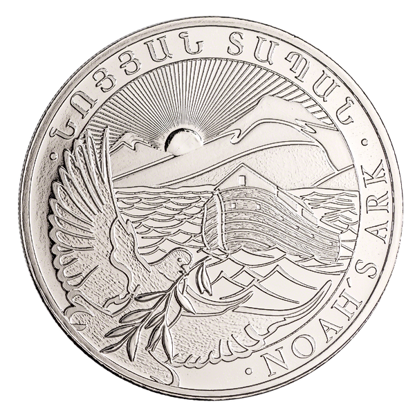 The 2022 silver Noah’s Ark is a silver bullion coin minted in 99.9% silver on behalf of the Republic of Armenia. With imagery depicting the famous Noah’s Ark voyage in the flood, the coin also shows the national coat of arms of Armenia.
