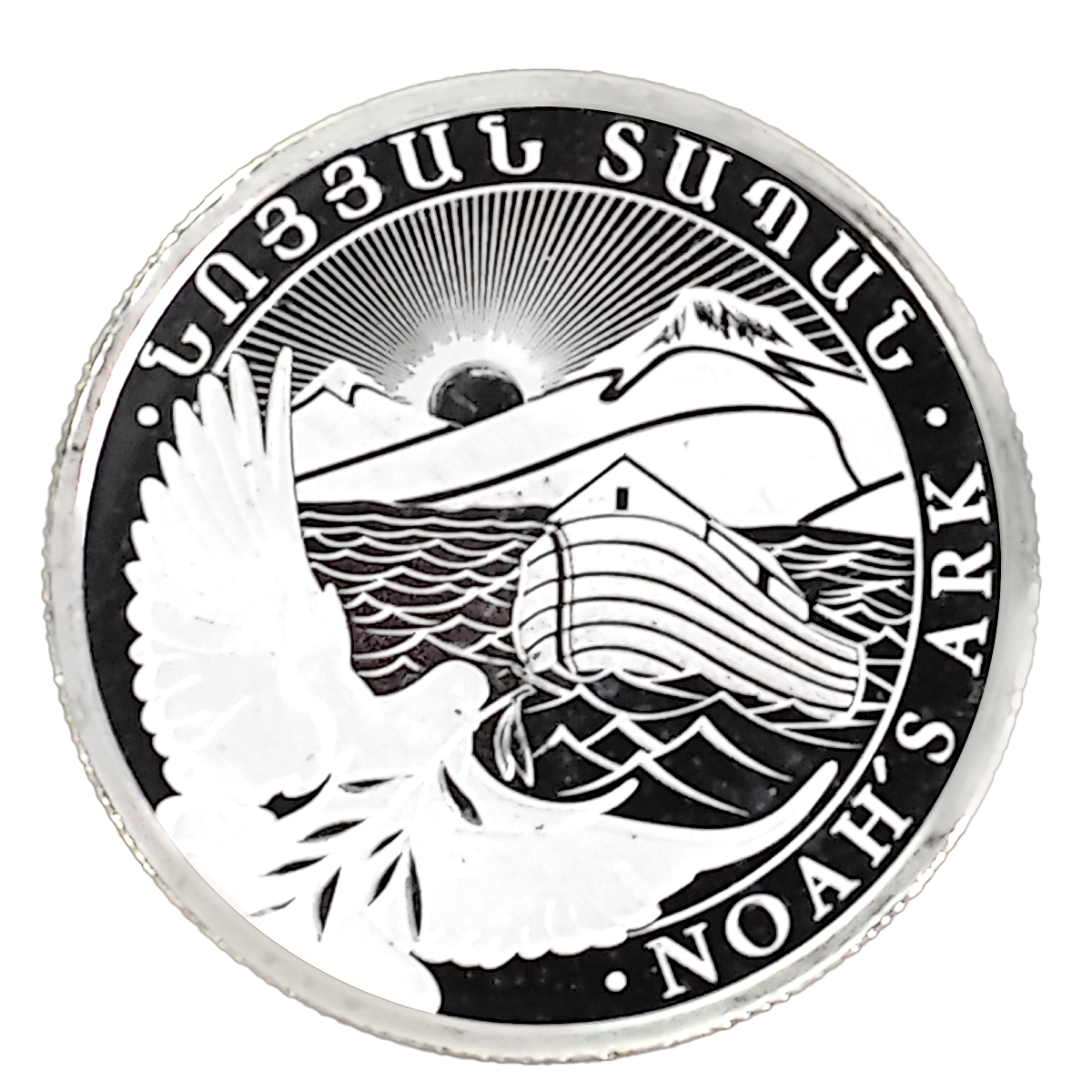 The reverse of the coin features a depiction of the Ark. In the background of the design you will see Mount Ararat, where the journey of Noah and his ark ended. Mount Ararat was a part of Armenia until the 20th century and after the first world war, when the country was divided between the Soviet Union and Turkey, Mount Ararat was given to Turkey. Even though Mount Ararat is no longer a part of Armenia, it is still a very important part of Armenian identity. In the foreground there is a dove carrying an olive branch, which, according to the Bible, portends the end of the flood. Beside this image there is imprinted the English name of the coin “Noah’s Ark” and its Armenian translation.