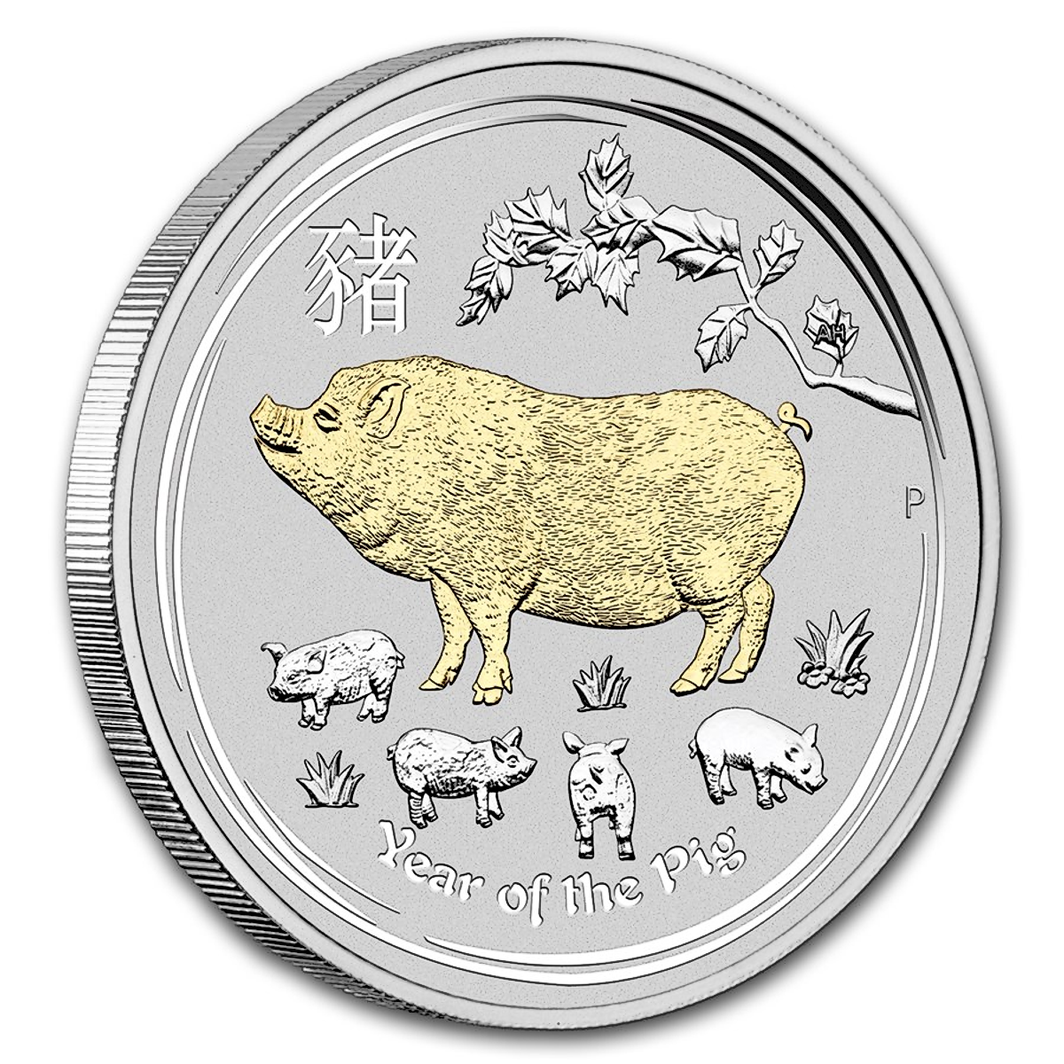The 12th coin of the popular Australian Lunar Series features an attractive scene of an adult pig with her four piglets amid stylised foilage, with the words 'Year of the Pig' encircled below.