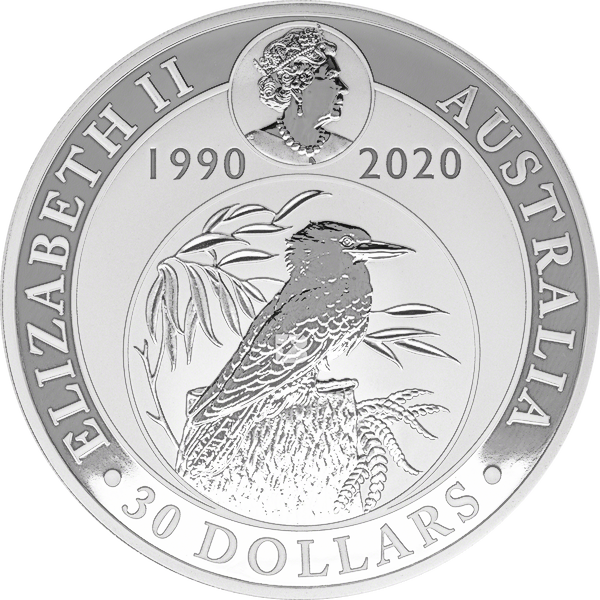The obverse of the 1 kg coin features the 1990 design, a kookaburra perched on a tree stump, as well as the dates 1990 - 2020.